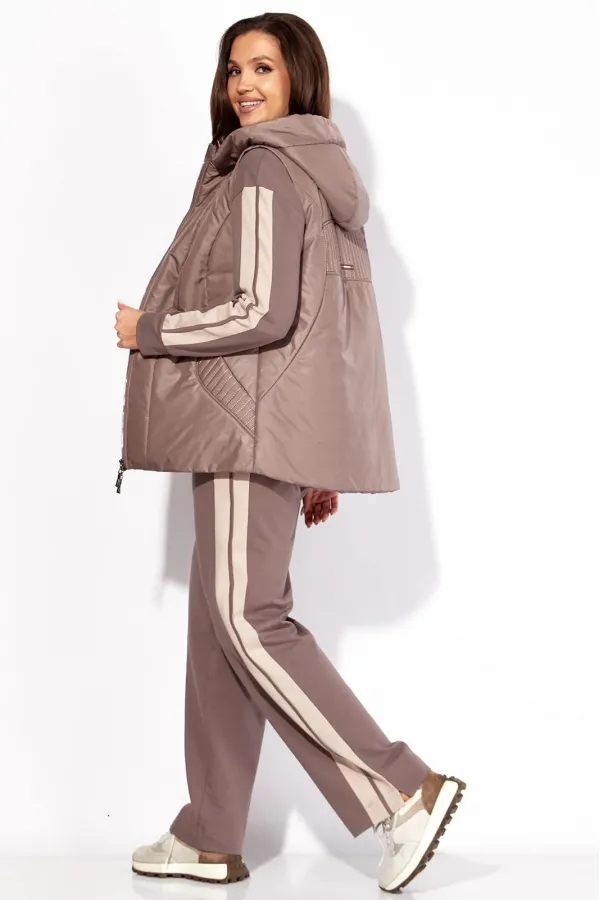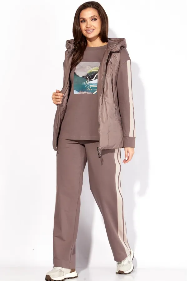 Свитшот прямого силуэта с отрезными бочками. Рукав длинный, со спущенной линией плеча, снизу на манжете. Горловина круглой формы с подрезной бейкой. Перед задекорирован принтом. Брюки прямые с карманами в боковых швах. По низу небольшой разрез. Пояс притачной с резинкой(по центру гладкий)По бокам брюк и по центру рукавов втачные отделочные лампасы с контрастным кантом. Жилет выполнен из плащевки на синтепоне(vs100) на подкладке, прямого силуэта. По переду рельефы из пройм в боковой шов. В рельефах карманы с отделочными деталями в форме клапана. Застежка центральная на тесьму молния Горловина оформлена капюшоном со стойкой и кулисой. По спинке фигурные рельефы. Центральная часть с отделочной деталью и декоративной нашивкой. Низ жилета по спинке чуть длиннее.