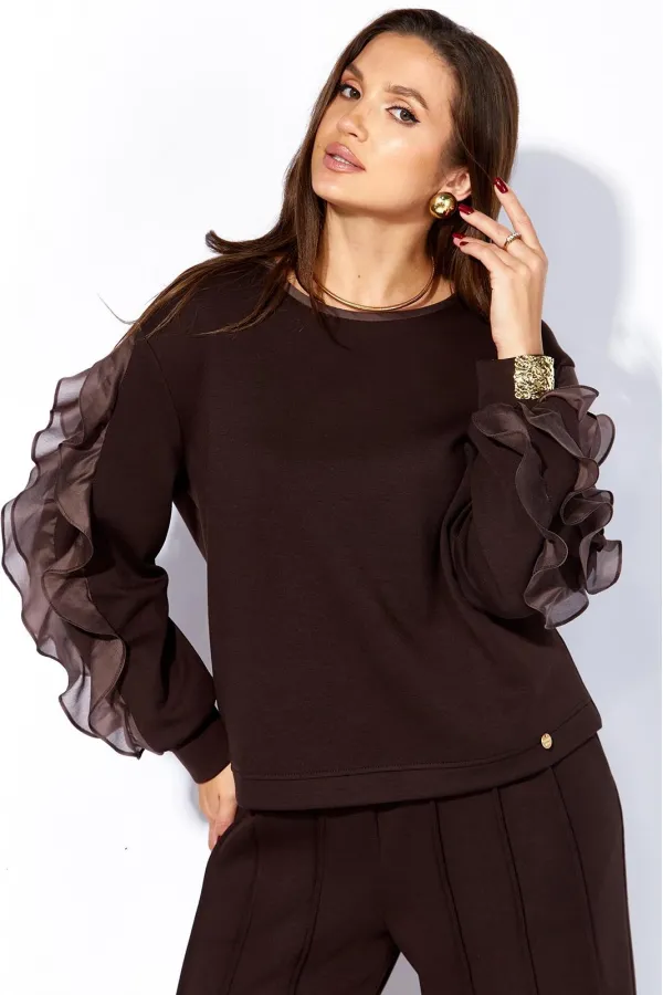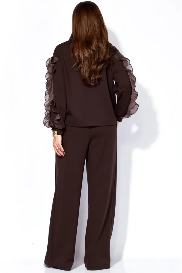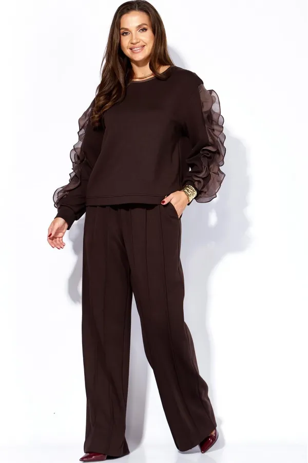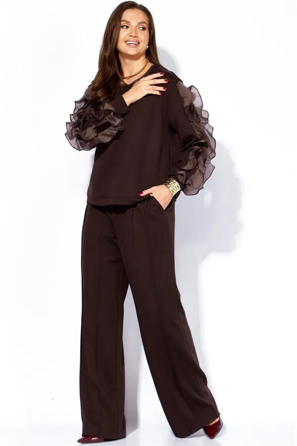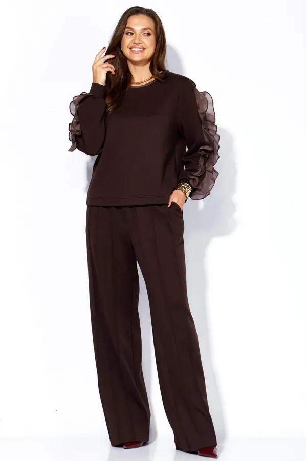 Комплект женский, 2х предметный, состоящий из джемпера и брюк, из трикотажного полотна. Джемпер прямого силуэта, с длинным рукавом. Рукава с чуть спущенной линией плеча, по низу на манжете, задекорирован по центру тремя рядами рюш из отделочной ткани. Вырез горловины круглой формы, с отделочной бейкой по переду. По низу переда подрезная планка. Спинка без особенностей. Брюки прямые, широкие. По переду по три ряда широких, застроченных на ребро рельефов и функциональные карманы. Пояс притачной с резинкой по кругу.