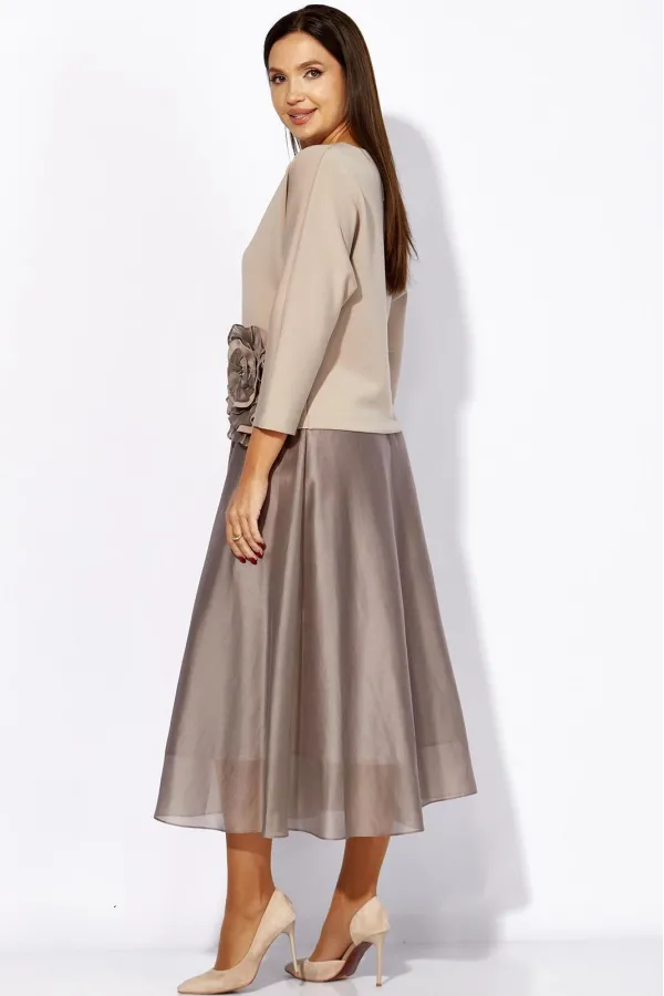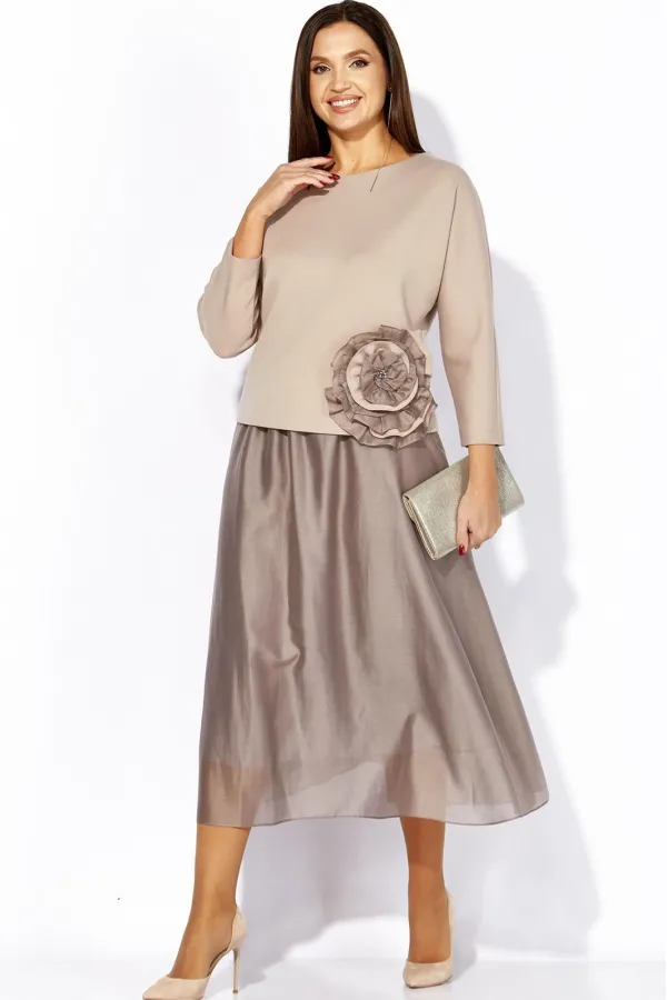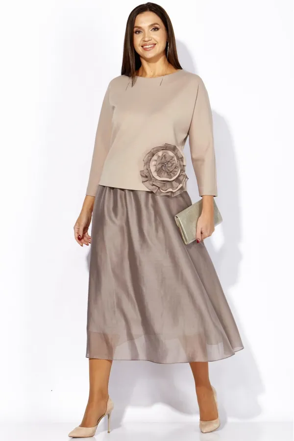Комплект женский, 2х предметный, состоящий из блузки и юбки. Блузка полуприлегающего силуэта с цельнокройным рукавом длинной 3/4. Выполнена из трикотажного полотна тенсел. Вырез горловины лодочка По низу блузки, слева, декоративный элемент из рюши, в сочетании двух видов ткани. По спинке средний шов. Юбка широкая к низу, из текстильной ткани вуалька На подкладке. Пояс притачной с резинкой по кругу.