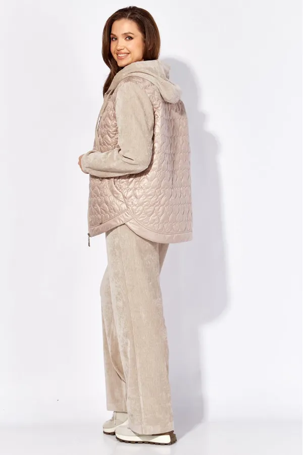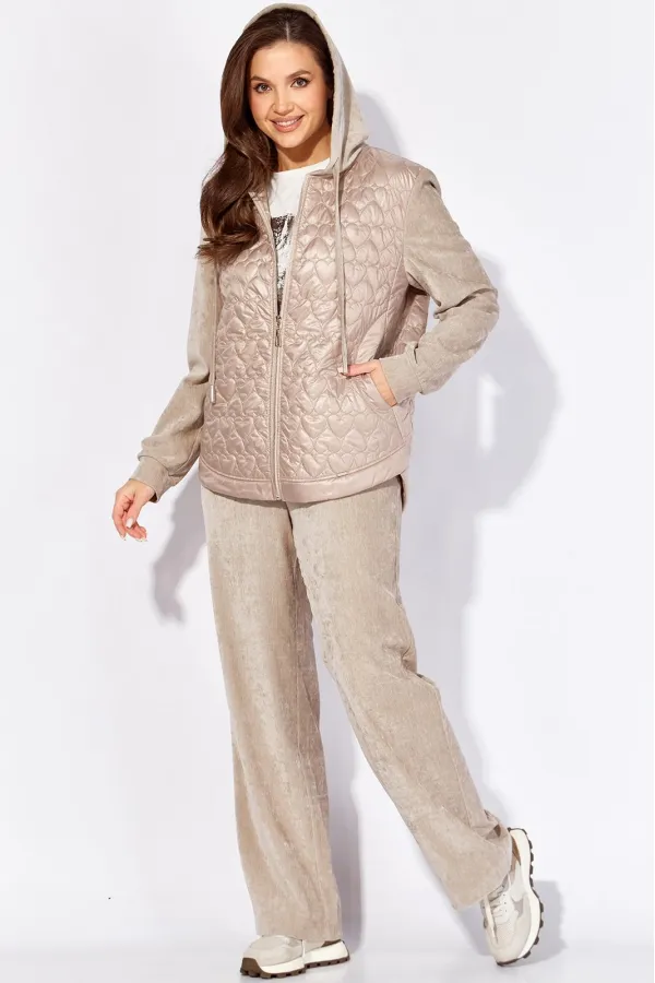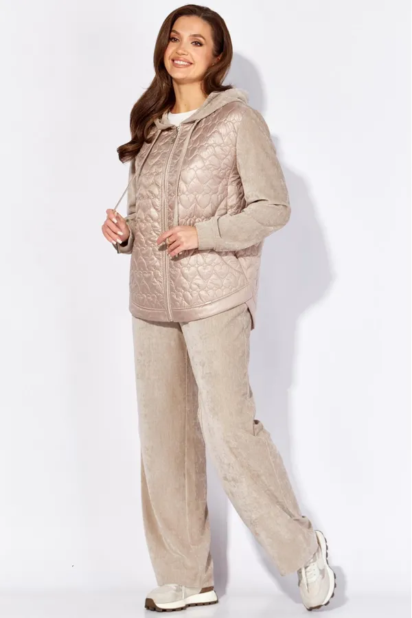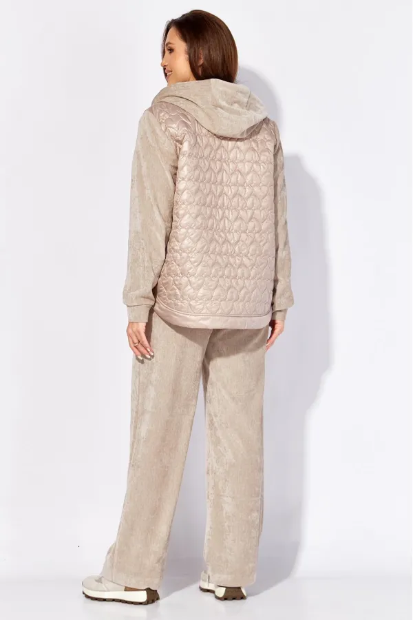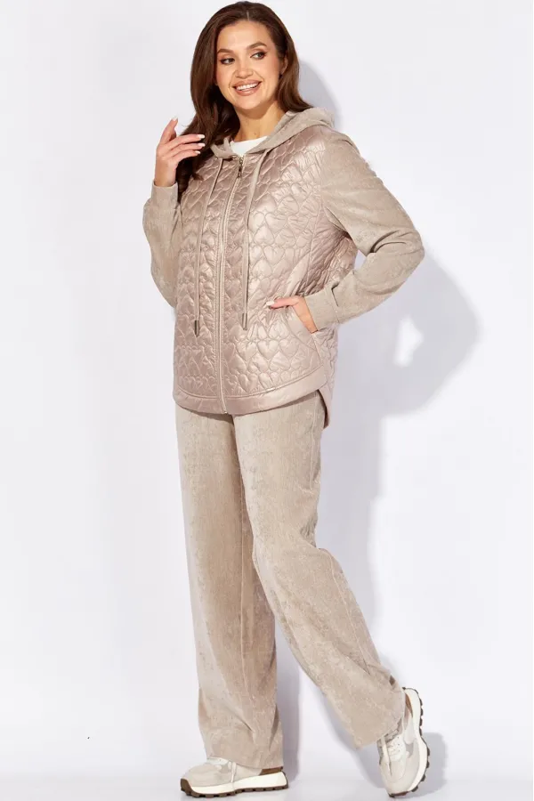 Комплект женский, 2х предметный, состоящий из куртки и брюк, выполнен из двух видов материала. Куртка с сочетании плащевки стеганой на синтепоне и Миланский вельвет со стрейчем. По переду рельефы из пройм, карманы. Вход в карман закругленной формы с отрезной планкой. Застежка центральная на тесьму молния Низ куртки фигурной формы, по спинке удлиннен, с отрезной планкой. Рукав длинный, втачной, по низу на манжете. Горловина оформлена капюшоном с кулисой по краю . Брюки прямые, выполнены из ткани Миланский вельвет. По переду наклонные карманы. Пояс притачной с резинкой по кругу.