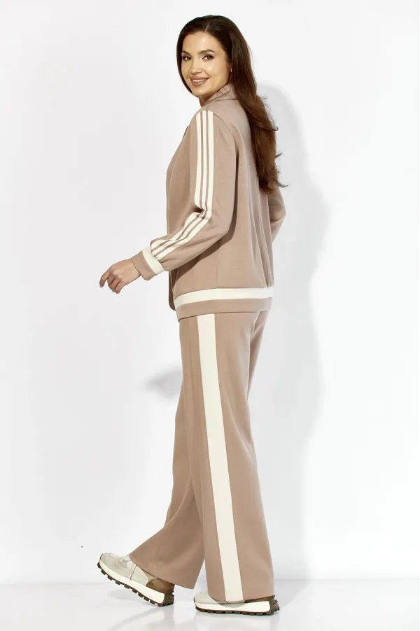 Комплект женский, двухпредметный, состоящий из жакета и брюк, из трикотажного полотна T E N S E L Жакет прямого силуэта, по низу на широкой подрезной планке. По переду вертикальные рельефы. Воротник отложной с лацканами. Крой борта, по низу, закруглен. Застежка центральная, на кнопки. Рукав втачной, длинный с отделочным лампасом и манжетой по низу. Манжета рукава и планка низа, с отделочными деталями. Спинка со средним швом. Жакет без подкладки . Брюки прямые. По переду фигурные рельефы.Карманы в рельефах. По боку отделочный лампас. Пояс притачной, с резинкой. Центральная часть пояса гладкая.