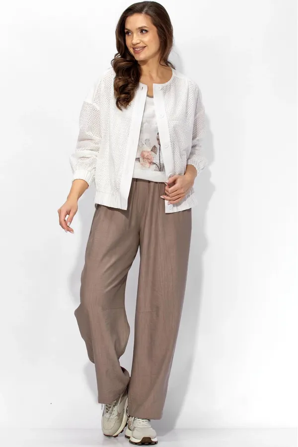 Комплект женский, 3х предметный, состоящий из бомбера , топа и брюк. Бомбер выполнен из ткани шитье с отделкой, прямого силуэта с длинным рукавом. Рукав со спущенной линией плеча. По низу рукава и бомбера, притачные манжеты с резинкой. Вырез горловины круглой формы . Застежка центральная, с отрезной планкой, на петли и пуговицы. Кокетка цельная, на перед и спинку. По центру спинки небольшая сборка. Брюки баррель объемные. По переду карманы. По шаговому шву вытачки, создающие объем в районе колена. Брюки без застежки, с имитацией гульфика Пояс притачной с резинкой по кругу и кулисой. Топ без рукавов. Горловина круглая, углубленная. Проймы и горловина окантованы бейкой в цвет брюк. Низ топа фигурной формы. Перед задекорирован принтом. Топ и брюки изготовлены из крешованной, вискозной ткани.