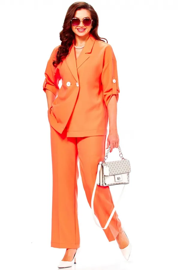Очень стильный, элегантный, модный женский комплект. Состоит их брюк палаццо и жакета прямого силуэта , со спущенной проймой ,что придает свободу движению и комфорта при носке. Интересный дизайн жакета , двубортный с одним рядом крупных пуговиц контрастного цвета. Рукав на пате с пуговицей контрастного цвета меньшего размера. При желании рукав можно удлинить ,расстегнув пуговицу. Длина жакета по спинке от плеча — 70,5 см Брюки палаццо прямые с функциональными карманами, сзади на резинке. Длина брюк -106 см. Рост модели 173 см.