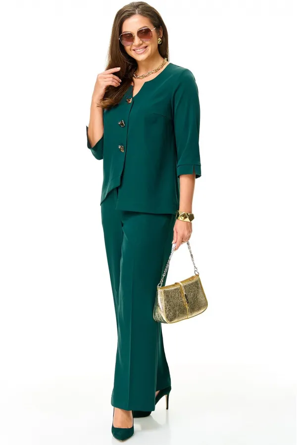 Красивый, элегантный офисный женский комплект. Состоит из жакета и классических брюк , из текстильной ткани хорошего качества. Жакет интересного дизайна , с фигурным вырезом, втачным рукавом , с золотыми красивыми пуговицами, одна пола по переду длиннее второй , что придает элегантность этому жакету. Длина жакета сзади от плеча 67 см , длина рукава 45 см , по низу рукава планка с разрезом посередине, Брюки классические, прямые, с функциональными карманами по бокам, пояс сзади на резинке.