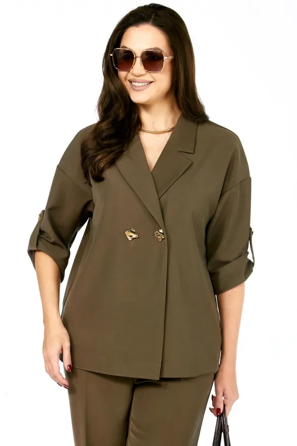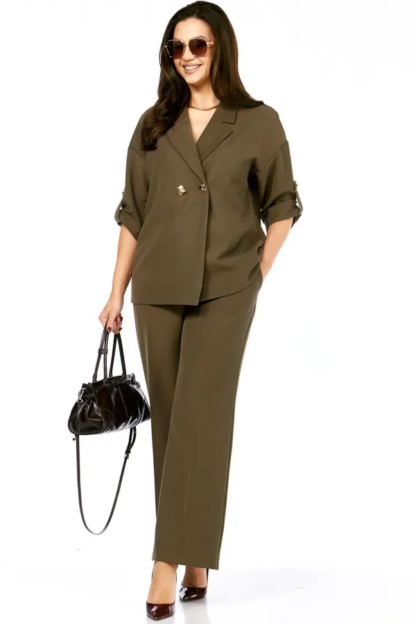 Очень стильный, элегантный, модный женский комплект. Состоит их брюк палаццо и жакета прямого силуэта, со спущенной проймой, что придает свободу движению и комфорта при носке. Интересный дизайн жакета , двубортный с одним рядом крупных пуговиц золотого цвета. Рукав на пате с пуговицей тоже золотого цвета , меньшим диаметром . При желании рукав можно удлинить ,расстегнув пуговицу. Длина жакета по спинке от плеча — 70 см. Брюки палаццо прямые с функциональными карманами, сзади на резинке. Длина брюк -105 см.