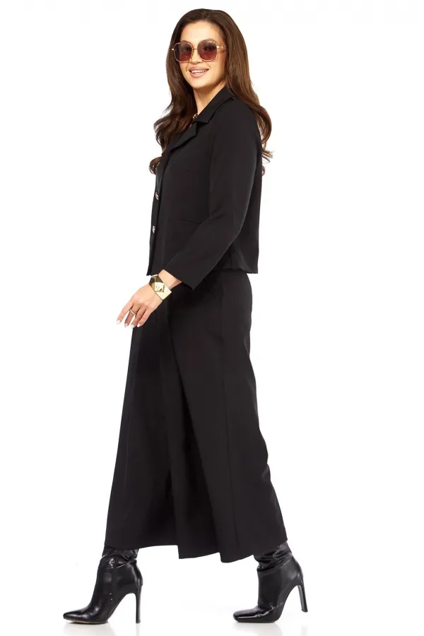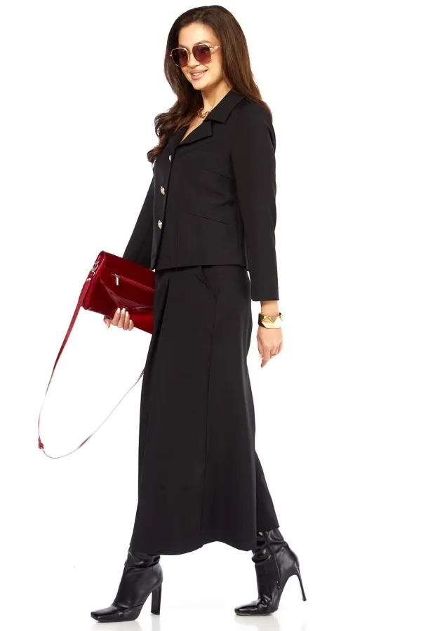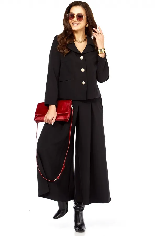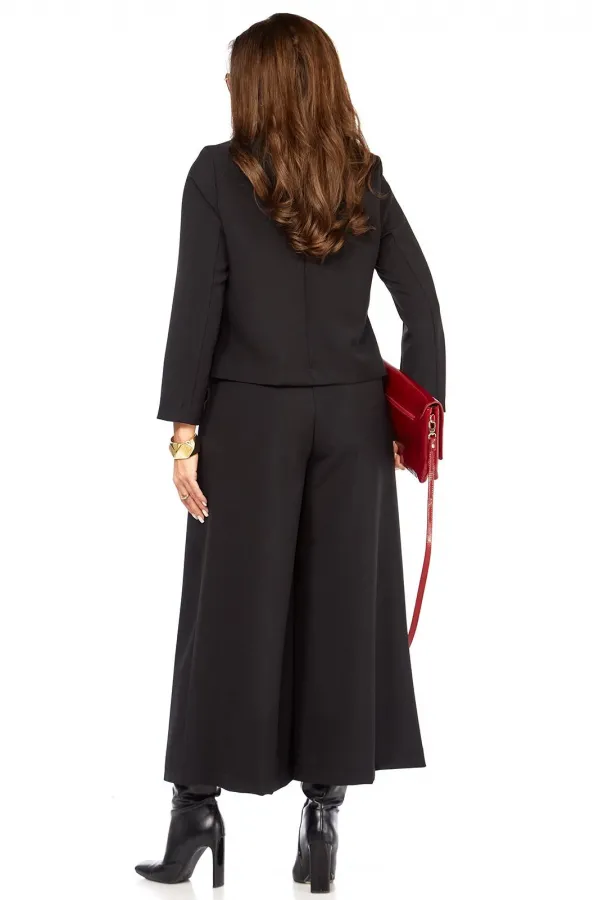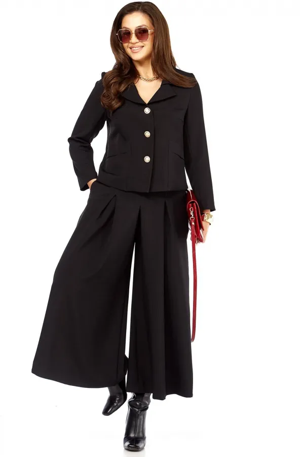 Стильный элегантный интересный женский комплект. Состоит из юбки- брюк ( кюлоты) и жакета. Жакет с интересным дизайном воротника, накладными карманами оригинального дизайна. Рукав длина — 58 см. Длина жакета от плеча по спинке 56 см. Кюлоты очень хорошей посадки с функциональными карманами по бокам, с тремя встречными складками спереди, сзади пояс на резинке, по поясу есть шлеки, что позволяет носить юбку-брюки с любым верхом, можно добавить ремень. Длина юбки-брюк 93 см.