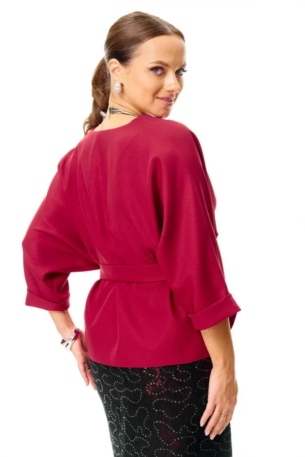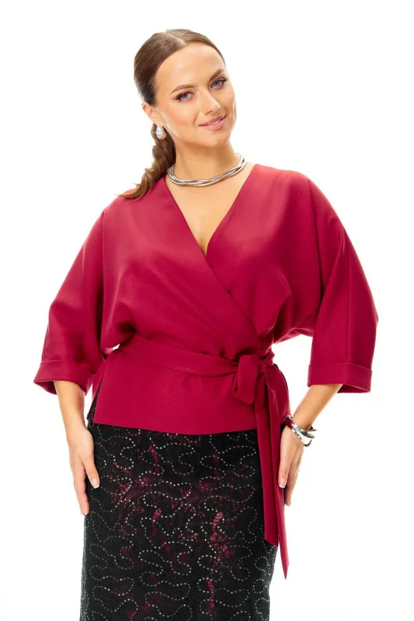 Блуза свободного силуэта. Горловина «на глубокий запах». Рукав цельнокроеный с манжетой. По низу переда планка, через которую протянут пояс. Спинка прямая.