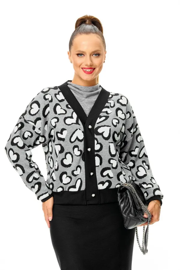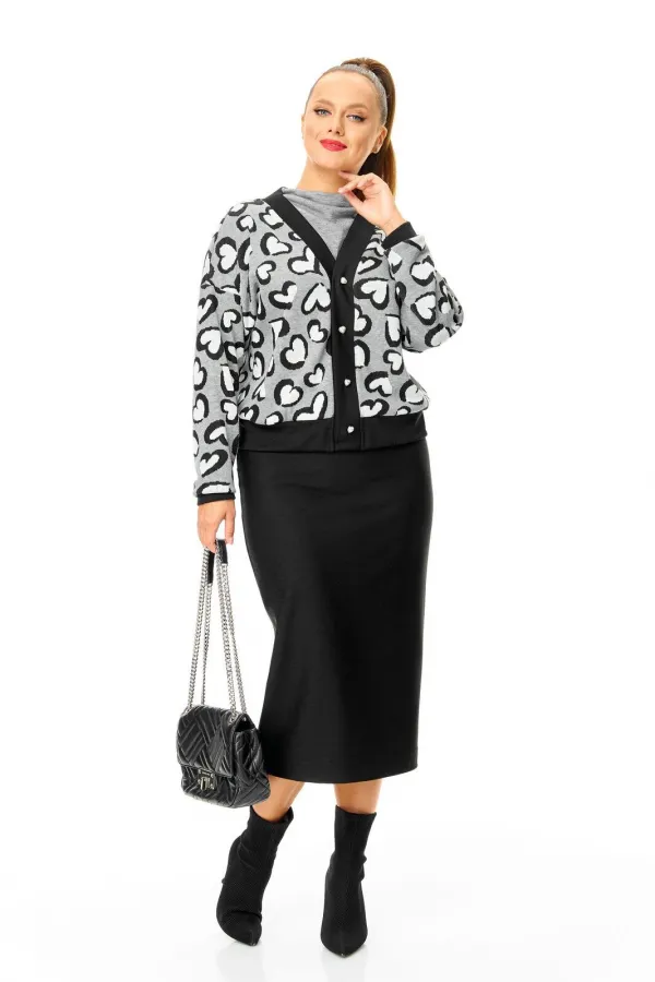 Комплект кардиган, юбка.Стильный трикотажный комплект: укороченный кардиган и юбка-midi в современном сочетании дизайн «сердце» и черного.Кардиган из уютного мягкого трикотажа, свободного силуэта, застегивается на пугови... Читать далее...