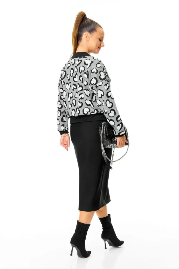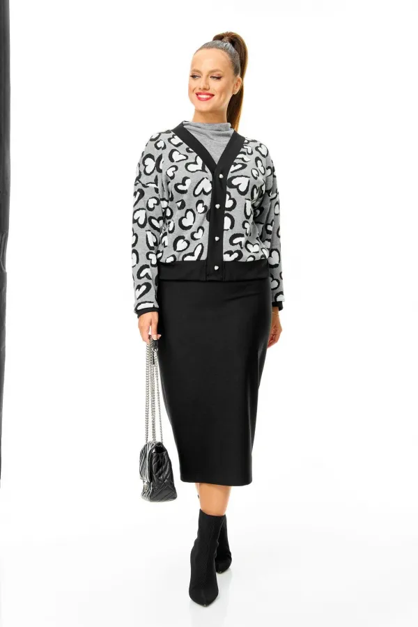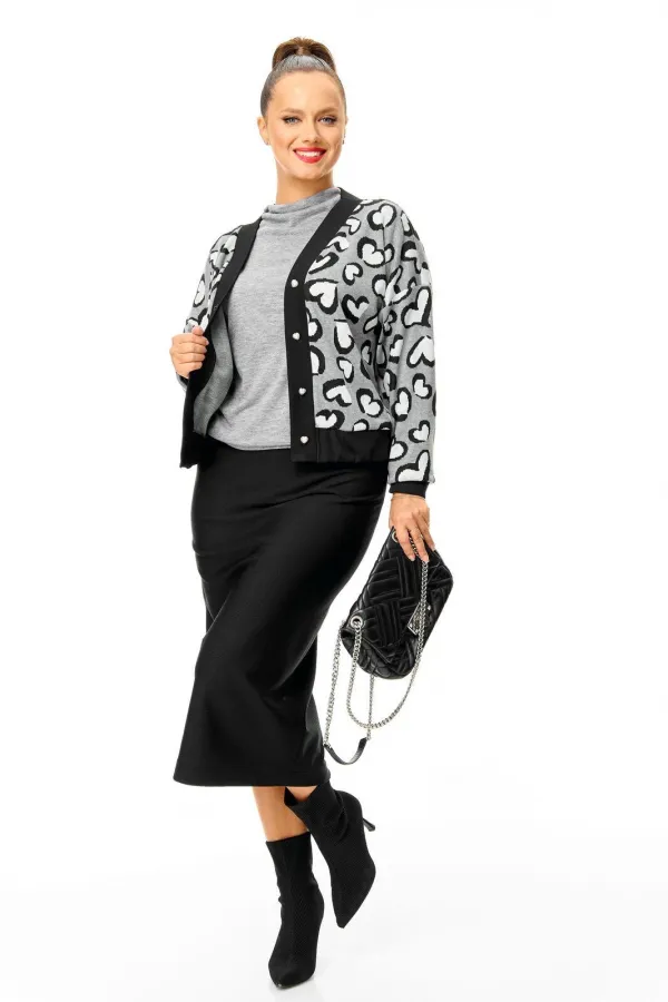 Стильный трикотажный комплект: укороченный кардиган и юбка-midi в современном сочетании дизайн «сердце» и черного.
