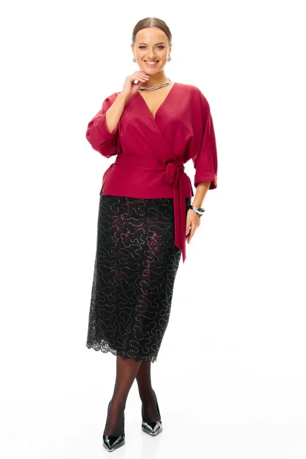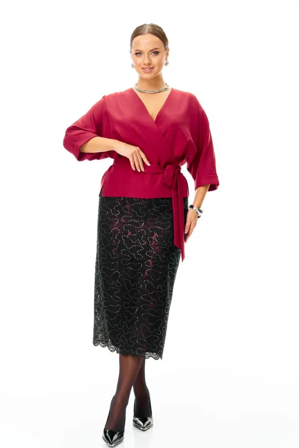 Комплект: блуза и юбка.Эффектный нарядный комплект в страстном цветовом сочетании глубокого красного с черным, блеск и кружево.Блуза свободного силуэта. Горловина «на глубокий запах». Рукав цельнокроеный с манжетой. По н... Читать далее...