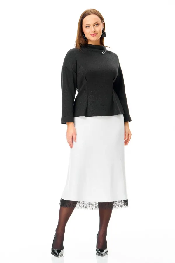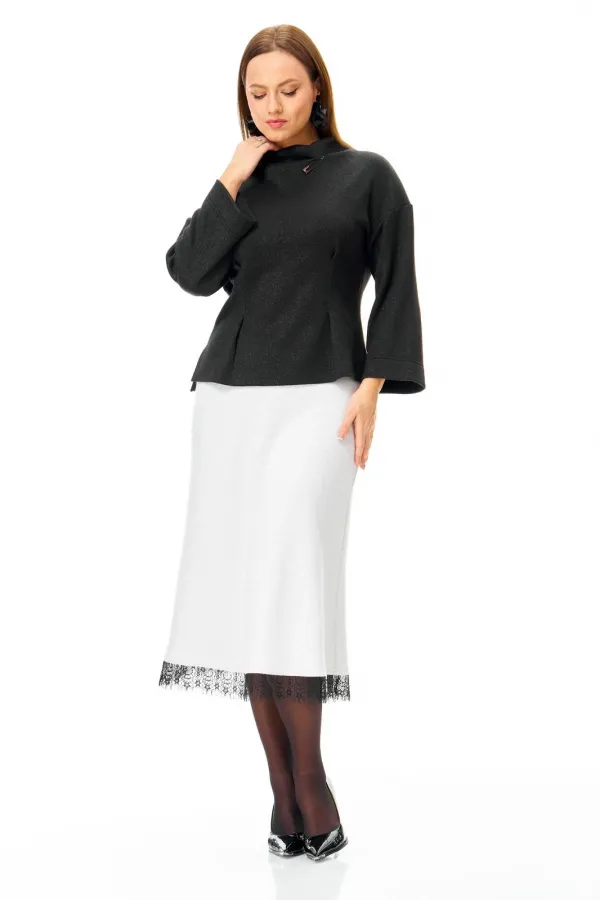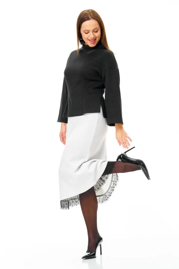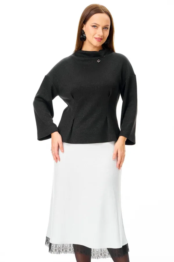 Классический черный трикотаж в сочетании с кружевом: слегка приталенный джемпер со съемными манжетами и юбка-midi.