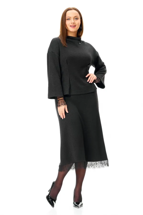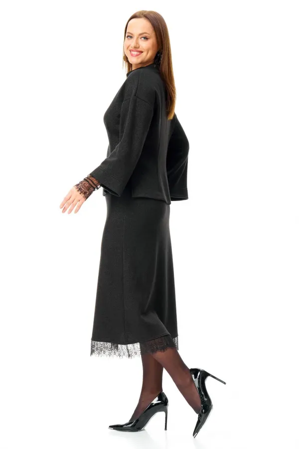 Классический черный трикотаж в сочетании с кружевом: слегка приталенный джемпер со съемными манжетами и юбка-midi.