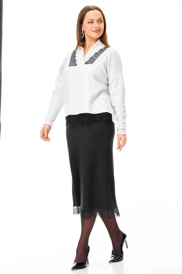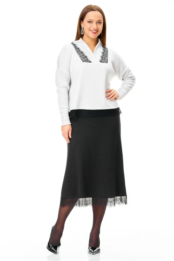Комплект : джемпер, юбка.Ворвемся в Новый год!Нарядный комплект из мягкого трикотажного полотна в сочетании с контрастным кружевом..Уютный джемпер свободного силуэта. Воротник с глубоким запахом переходит в планку на ... Читать далее...
