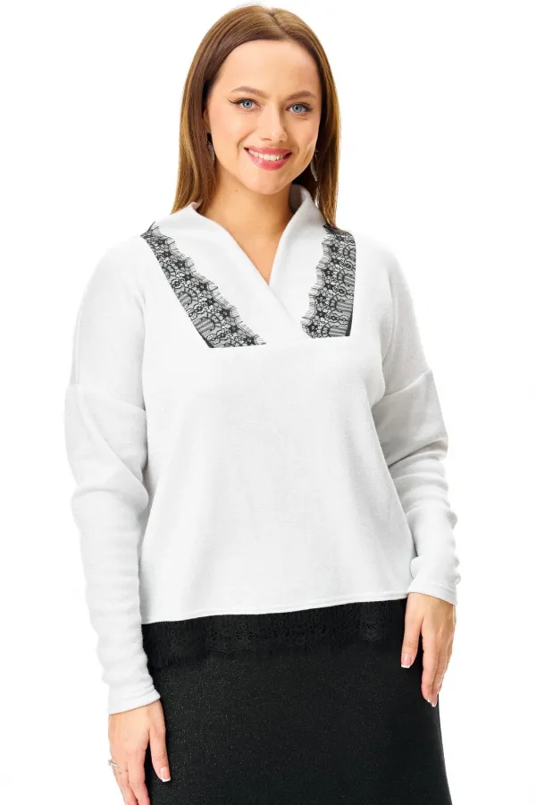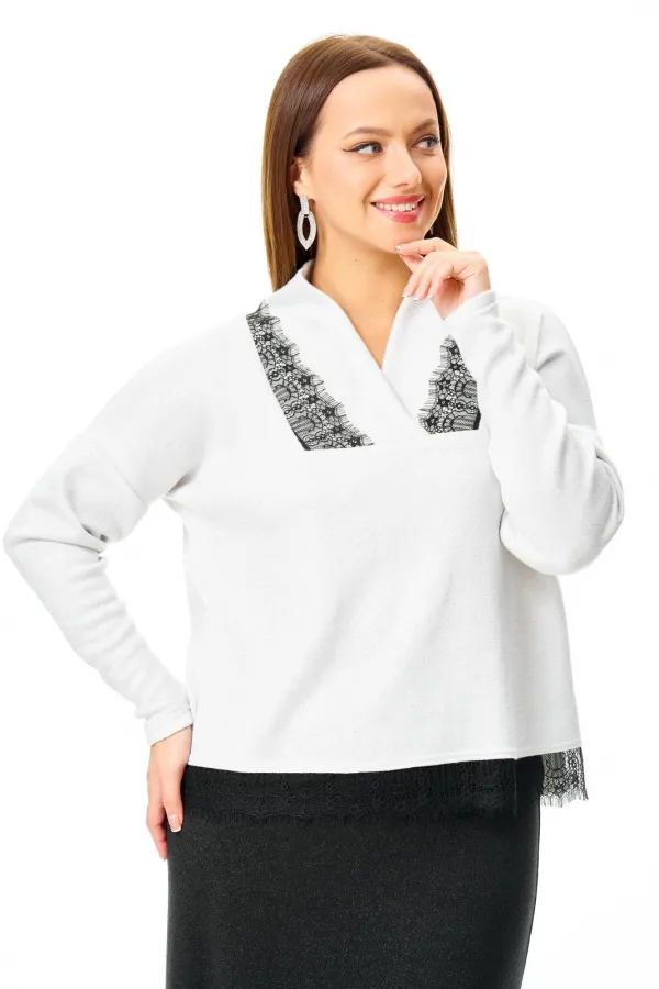 Уютный джемпер свободного силуэта. Воротник с глубоким запахом переходит в планку на груди. Рукав зауженный длинный. Воротник и низ переда с кружевной отделкой.