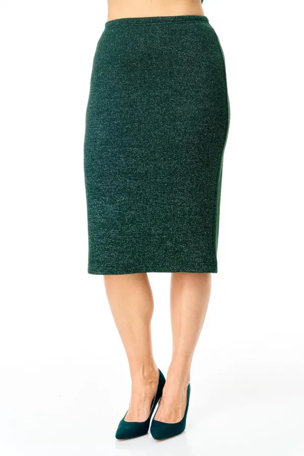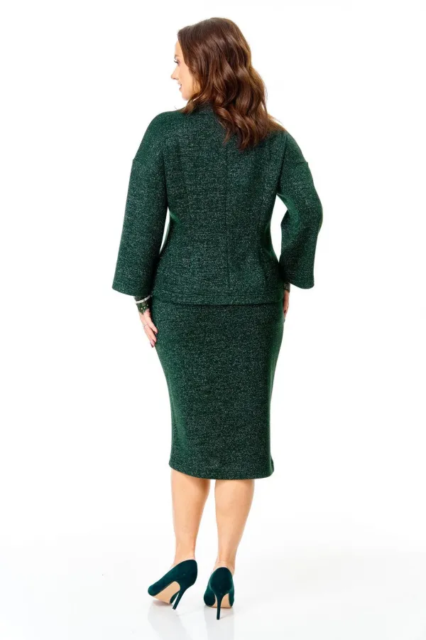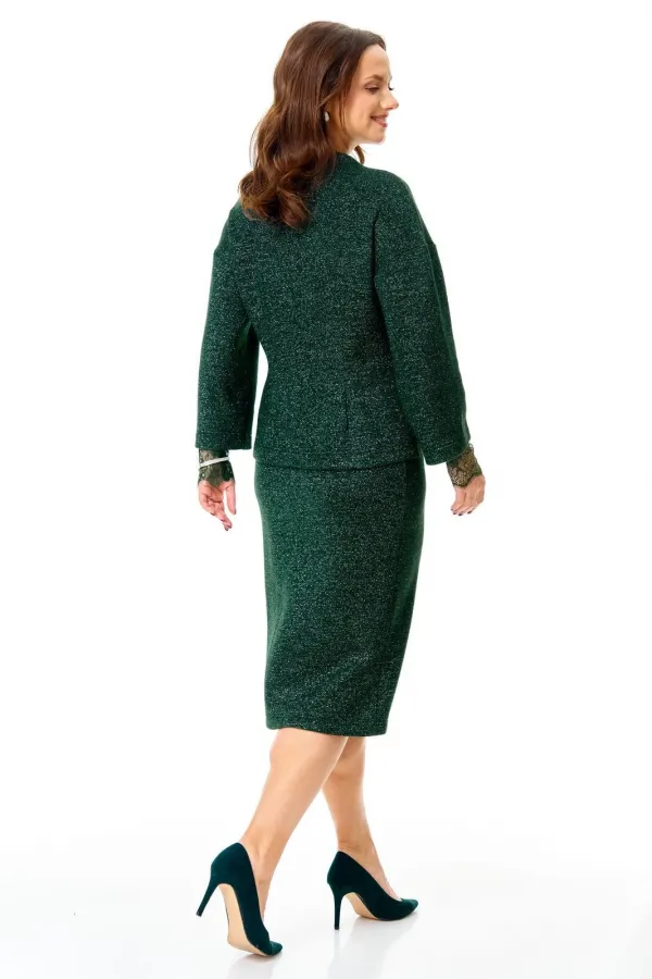 Уютный трикотажный комплект в глубоком изумрудном цвете с серебристой люрексовой нитью: зауженная юбка и слегка приталенный джемпер со съемными кружевными манжетами и брошью.