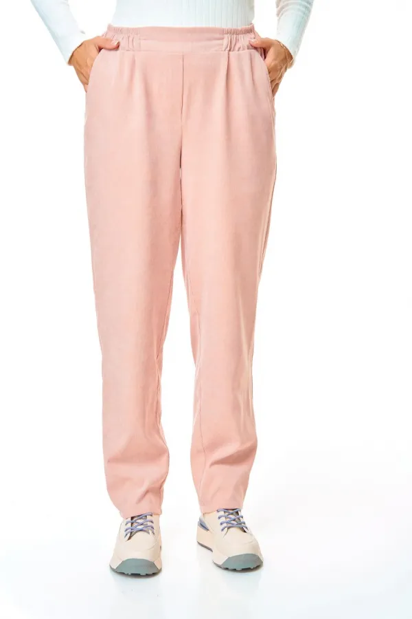 Удобные брюки из микро вельвета с высокой посадкой на талии, с глубокими карманами, по поясу резинка.