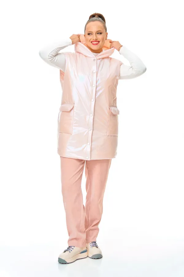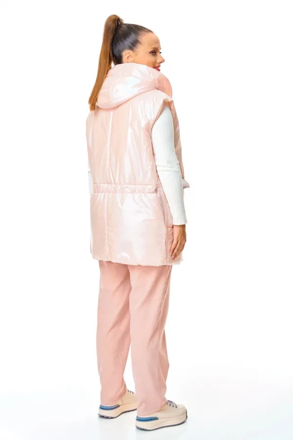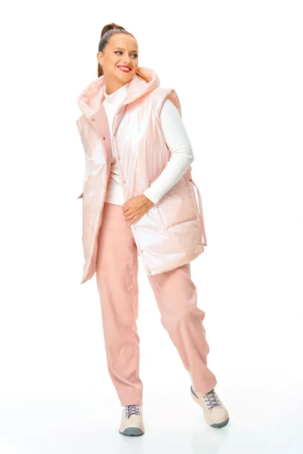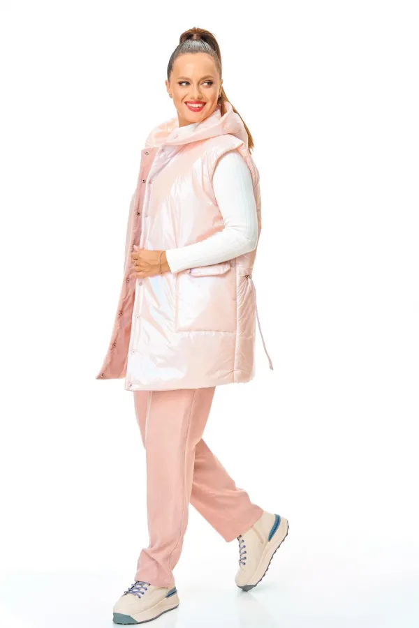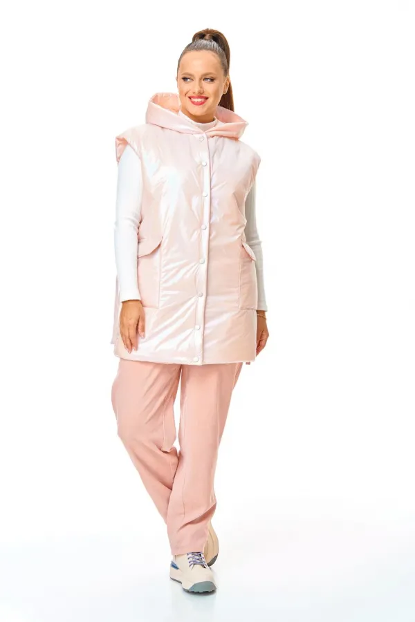 Комплект 2-х предметный: жилет и брюки.Комплект для ранней весны из воздушного жилета и брюк из бархатистого микро-вельвета в нежном цвете.Удлиненный жилет с глубоким капюшоном на легком утеплителе синтепон. Застежка на ... Читать далее...