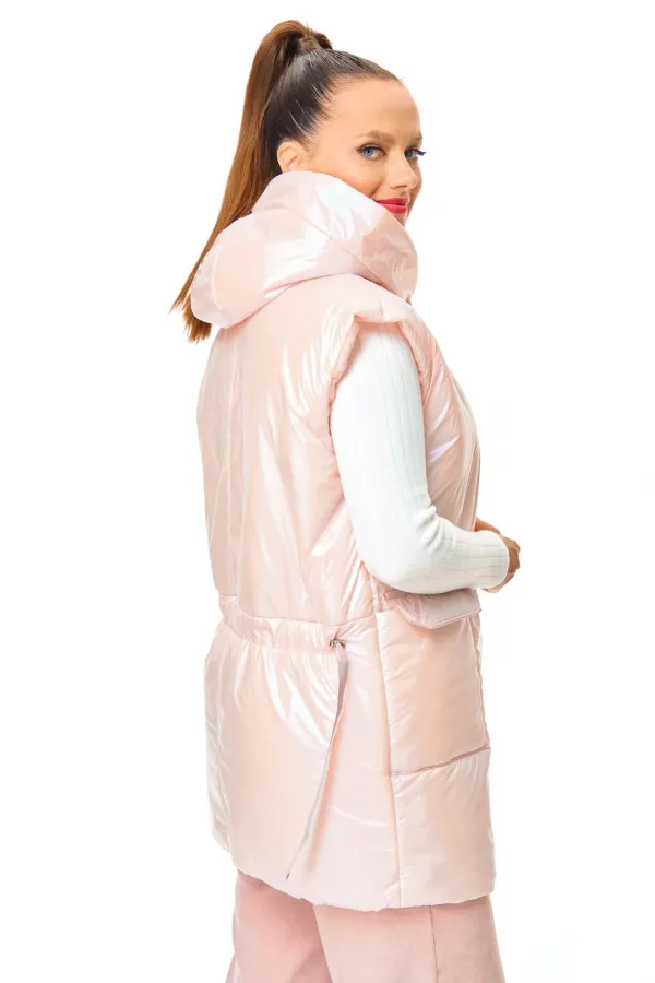 Удлиненный жилет с глубоким капюшоном на легком утеплителе синтепон. Застежка на кнопки. По переду накладные карманы с клапаном. Низ затягивается на кулиску. Жилет на подкладке.