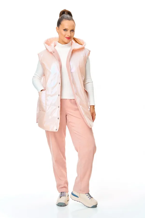 Комплект для ранней весны из воздушного жилета и брюк из бархатистого микро-вельвета в нежном цвете.