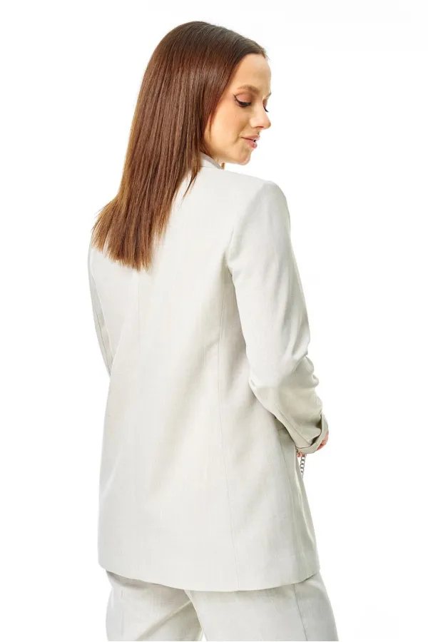 Свободный жакет с воротником и лацканами, застегивается на петлю и пуговицу, с прорезными карманами по переду. Рукав длинный. Жакет по переду и спинке на подкладке.