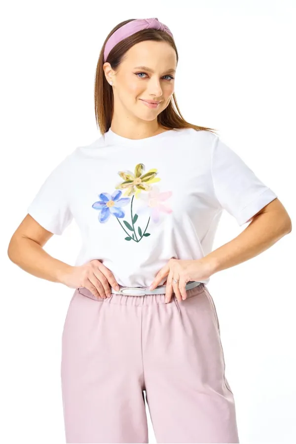 Стильный лонгслив белого цвета из трикотажного полотна. С круглой горловиной. Рукав втачной короткий. Яркая термо-аппликация по переду.
