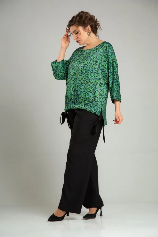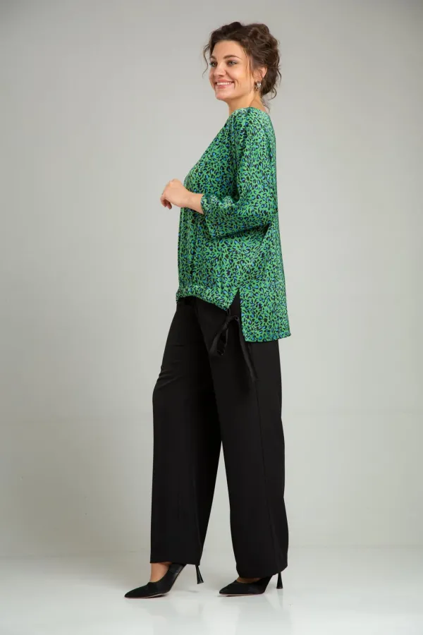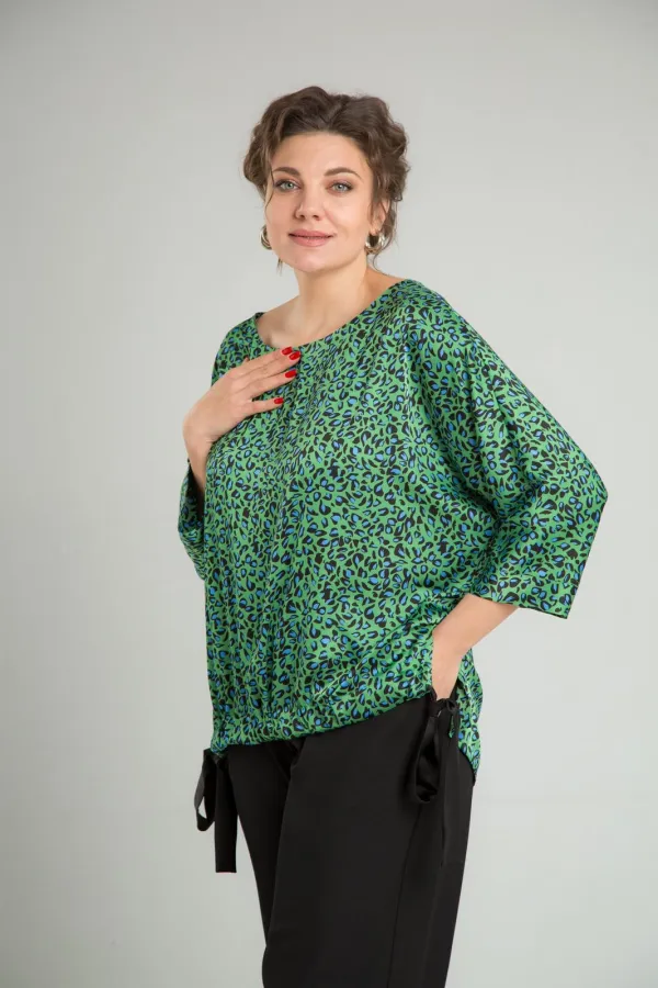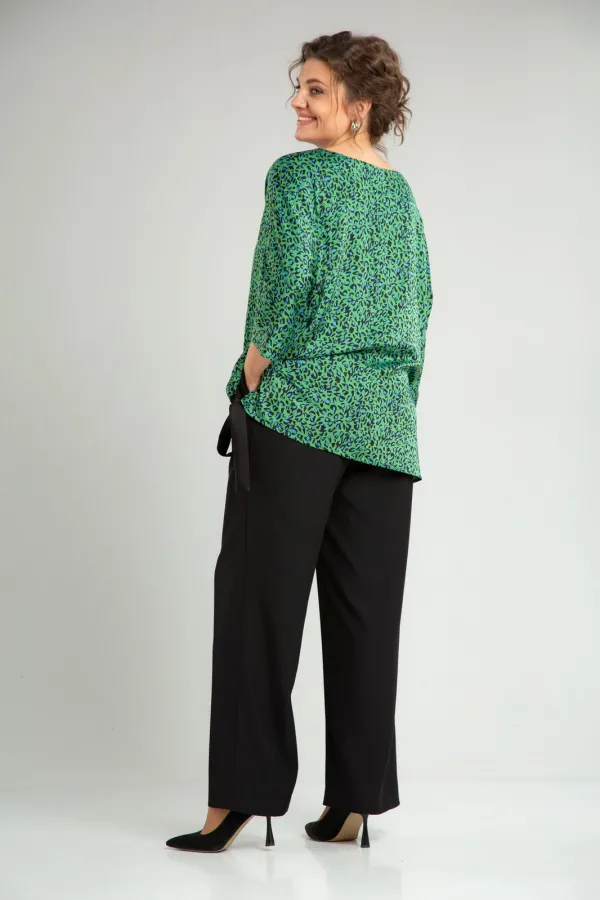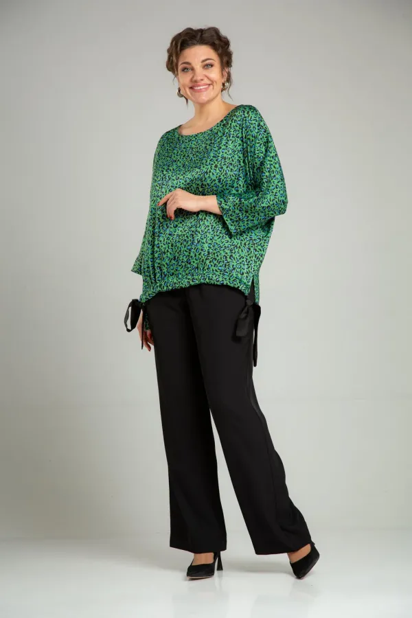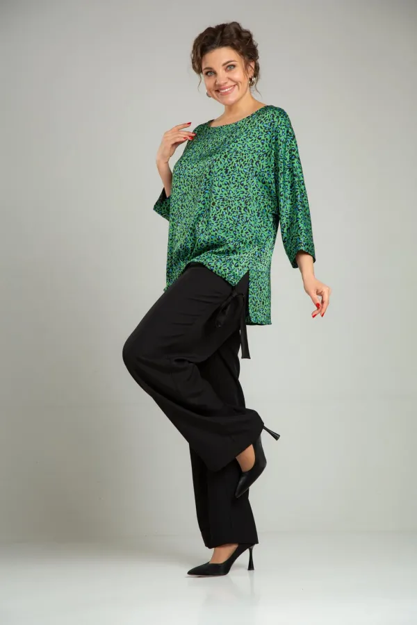Комплект женский нарядный двойка, состоит из блузона свободного покроя и брюк. Блузон из плательно-костюмной ткани типа атлас с принтом. По спинке средний шов, перед цельный, горловина округлой формы обработана обтачкой. В боковых швах разрезы, линия низа переда и спинки ассиметричны. Низ переда стягивается отделочным поясом. Рукав 3/4 типа летучая мышь, по низу манжета. Брюки свободного покроя, прямые к низу, с поясом на резинке, в боковых швах функциональные карманы.