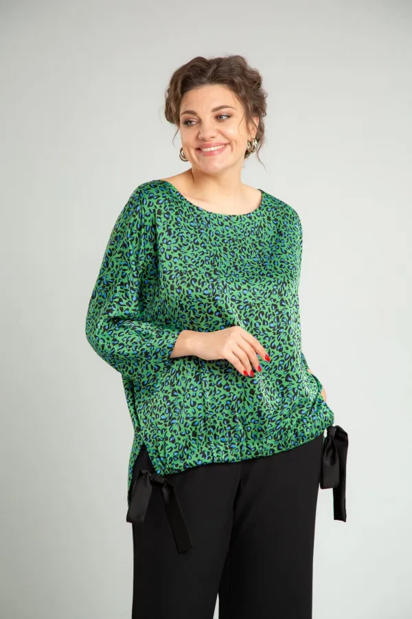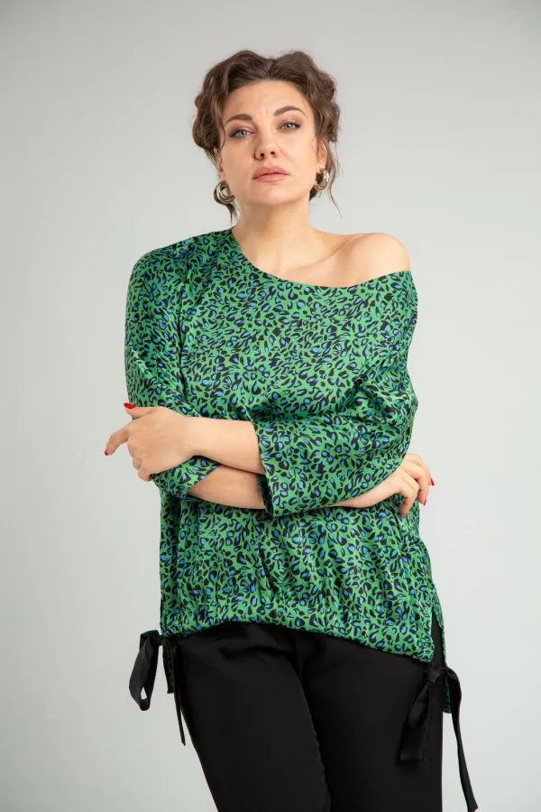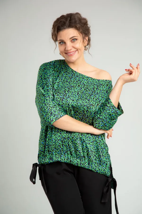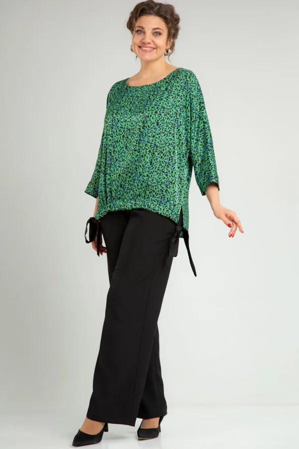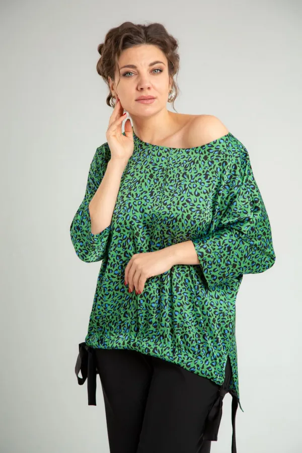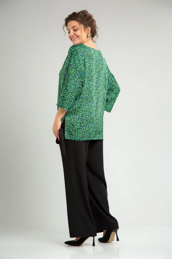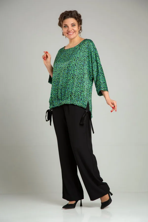 Комплект женский нарядный двойка, состоит из блузона свободного покроя и брюк. Блузон из плательно-костюмной ткани типа атлас с принтом. По спинке средний шов, перед цельный, горловина округлой формы обработана обтачкой. В боковых швах разрезы, линия низа переда и спинки ассиметричны. Низ переда стягивается отделочным поясом. Рукав 3/4 типа летучая мышь, по низу манжета. Брюки свободного покроя, прямые к низу, с поясом на резинке, в боковых швах функциональные карманы.