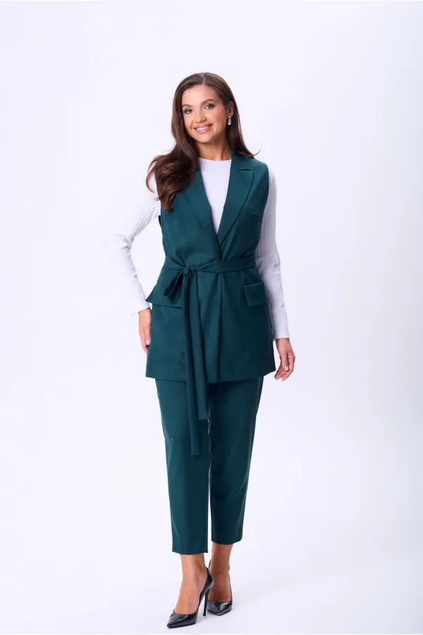 Комплект женский тройка состоит из жилета и брюк, выполнены из плательно-костюмной ткани, и лонгслива из трикотажного полотна «лапша». Жилет прямого силуэта, по переду центральная застежка на петлю и пуговицу, накладные карманы с отложным клапаном, нагрудные вытачки от вертикального рельефа. По спинке средний шов. Воротник пиджачного типа с лацканом. Брюки прямые классические на поясе с резинкой по спинке, шлевки. Карманы в боковых швах. По переду застежка с гульфиком. Лонгслив полуприлегающего силуэта. Перед и спинка цельные, рукав втачной длинный, горловина округлой формы, обработана планкой. В комплект входит сьемный пояс из основной ткани.
