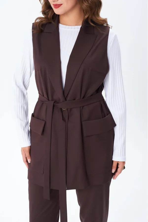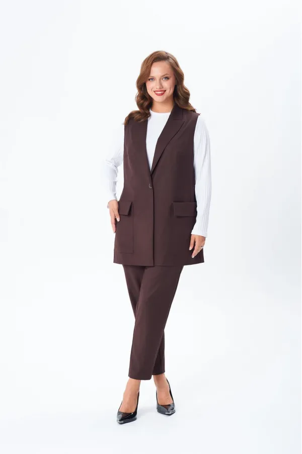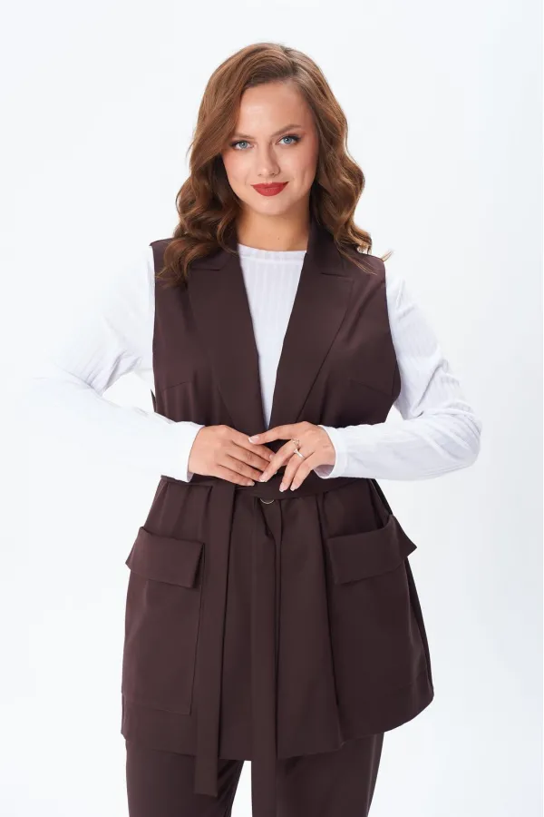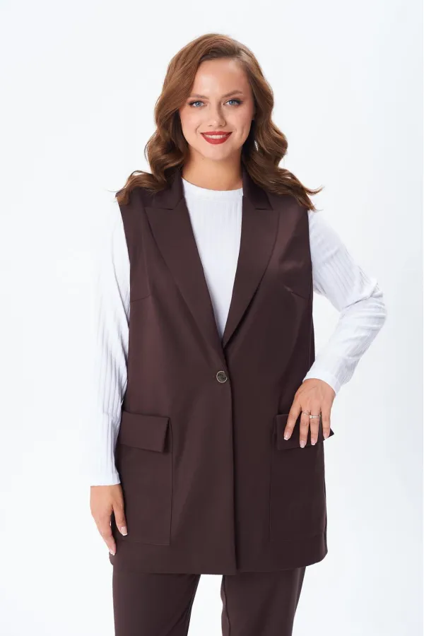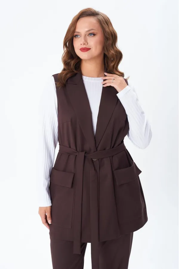 Комплект женский тройка состоит из жилета и брюк, выполнены из плательно-костюмной ткани, и лонгслива из трикотажного полотна «лапша». Жилет прямого силуэта, по переду центральная застежка на петлю и пуговицу, накладные ... Читать далее...