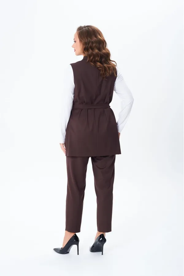 Комплект женский тройка состоит из жилета и брюк, выполнены из плательно-костюмной ткани, и лонгслива из трикотажного полотна «лапша». Жилет прямого силуэта, по переду центральная застежка на петлю и пуговицу, накладные карманы с отложным клапаном, нагрудные вытачки от вертикального рельефа. По спинке средний шов. Воротник пиджачного типа с лацканом. Брюки прямые классические на поясе с резинкой по спинке, шлевки. Карманы в боковых швах. По переду застежка с гульфиком. Лонгслив полуприлегающего силуэта. Перед и спинка цельные, рукав втачной длинный, горловина округлой формы, обработана планкой. В комплект входит сьемный пояс из основной ткани.