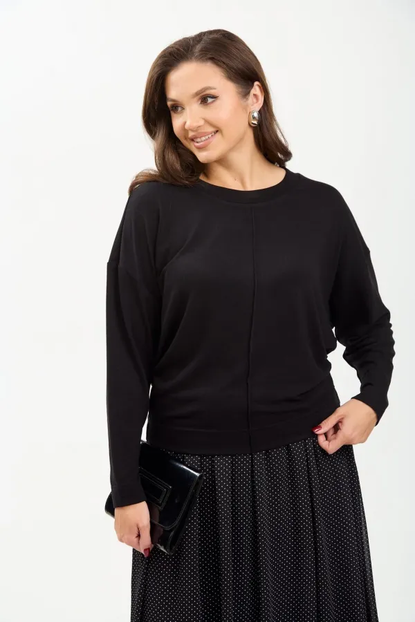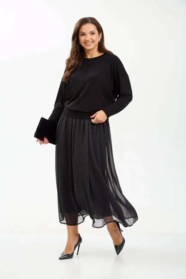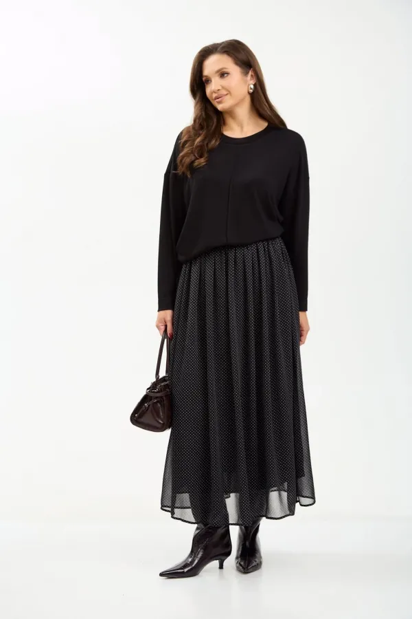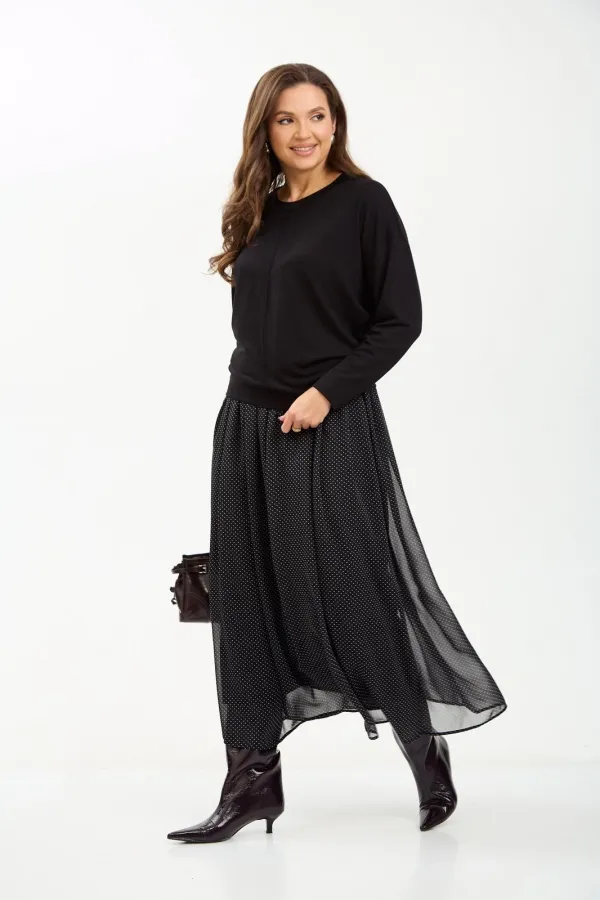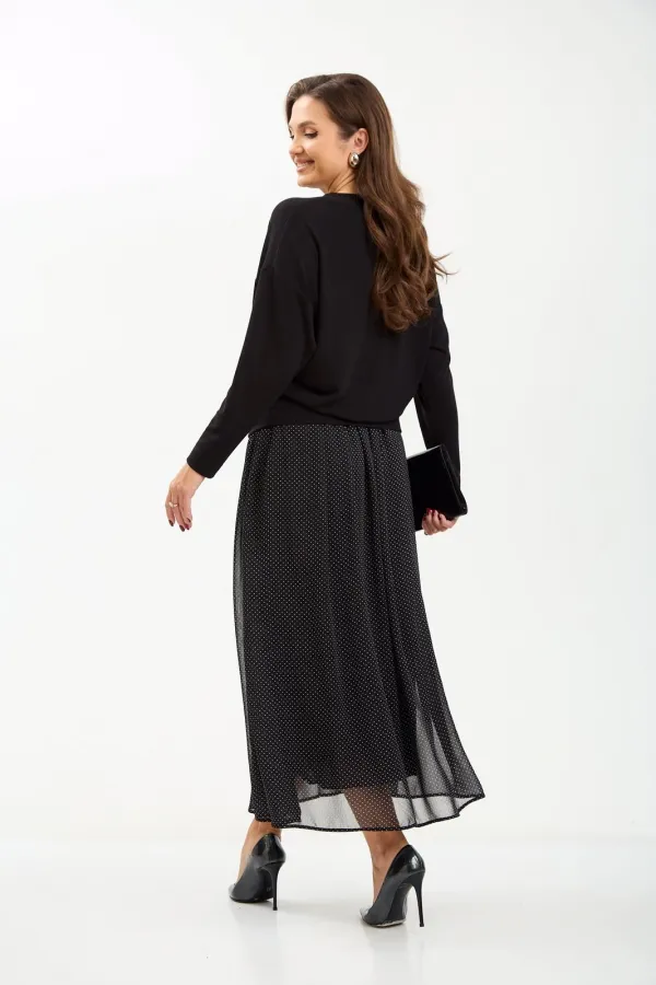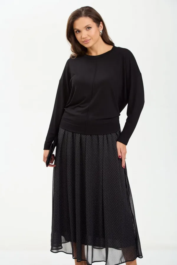 Комплект женский состоит из джемпера и юбки. Джемпер трикотажный свободного покроя типа летучая мышь. По переду и спинке по центру вертикальный декоративный защип, который визуально вытягивает фигуру. Горловина округлой формы, обработана планкой из основной ткани. Юбка миди из шифона с принтом в мелкий горошек. Пояс на резинке. Юбка на подкладке.