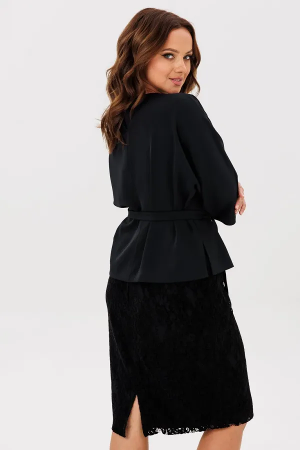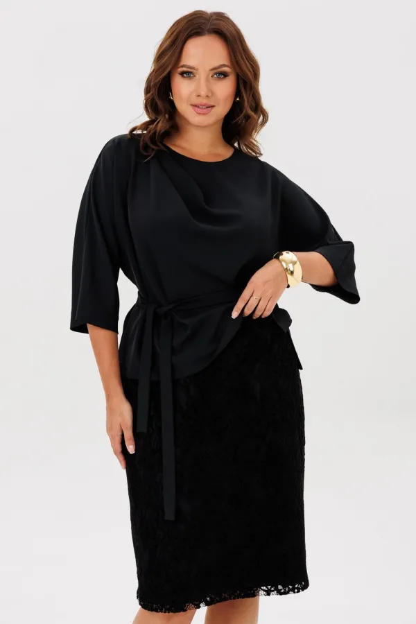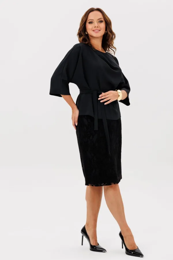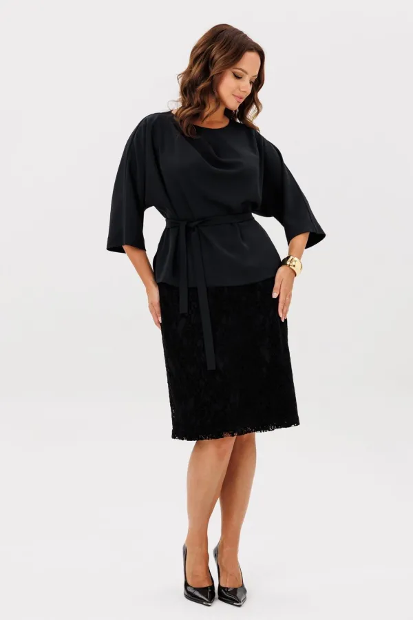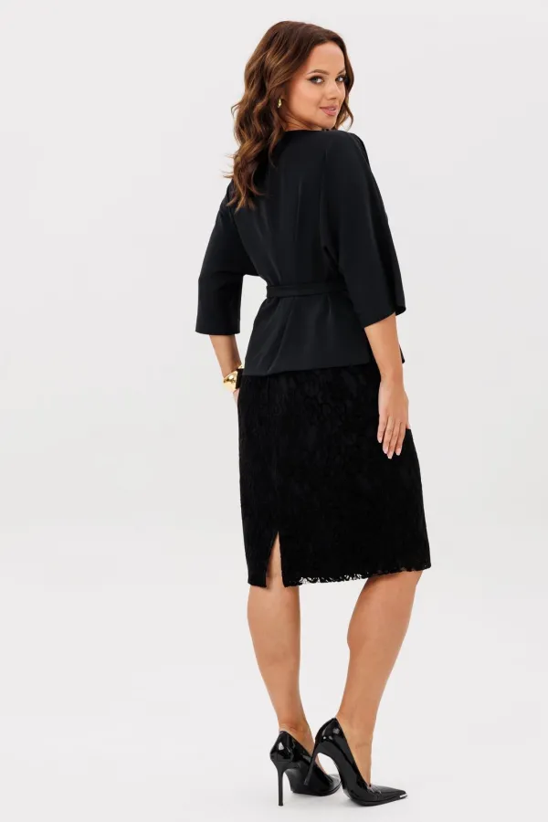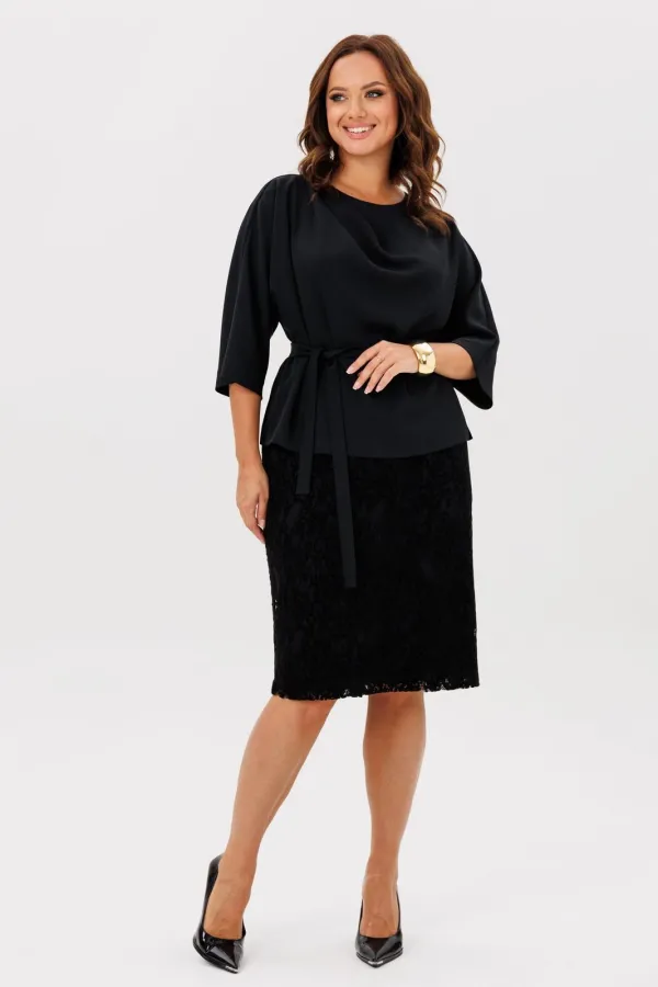 Комплект женский состоит из блузки и юбки. Блузка с цельнокроеным рукавом длиной 3/4. От правого плеча идут мягкие складки к центру переда. Застежка по центру спинки на петлю и пуговицу. По бокам небольшие разрезы. Блузка с поясом. Юбка на поясе выполнена из кружевного полотна на подкладке из основной ткани. На поясе по бокам эластичная тесьма. По среднему шву задней половинки юбки молния, снизу разрез 13,5 см.