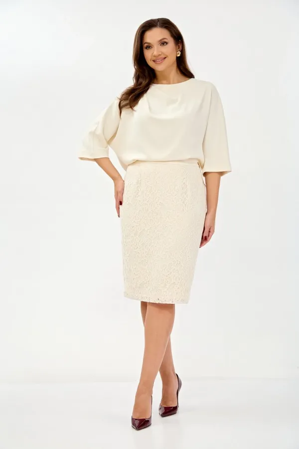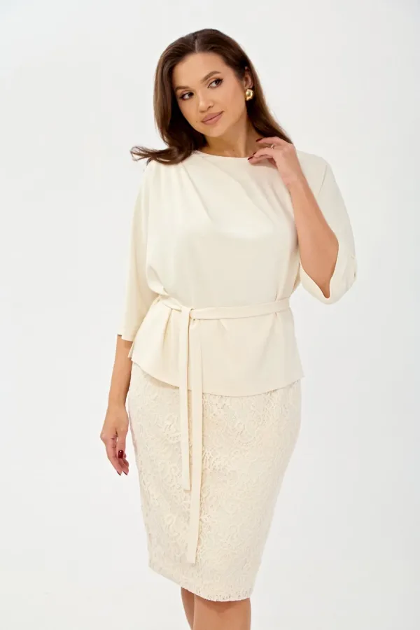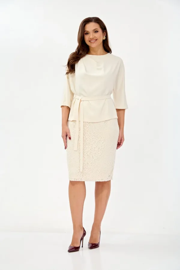 Комплект женский состоит из блузки и юбки. Блузка с цельнокроеным рукавом длиной 3/4. От правого плеча идут мягкие складки к центру переда. Застежка по центру спинки на петлю и пуговицу. По бокам небольшие разрезы. Блузка с поясом. Юбка на поясе выполнена из кружевного полотна на подкладке из основной ткани. На поясе по бокам эластичная тесьма. По среднему шву задней половинки юбки молния, снизу разрез 13,5 см.