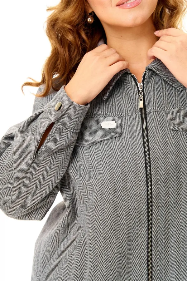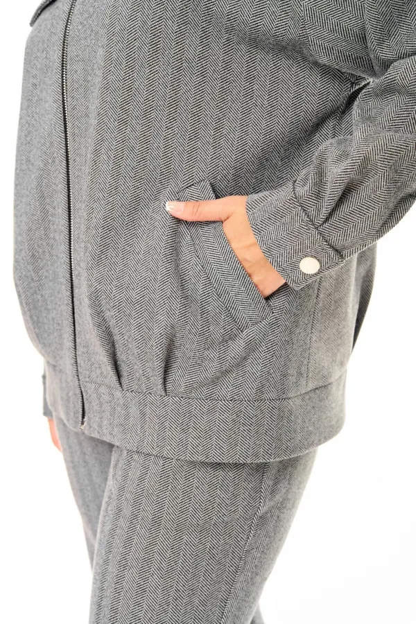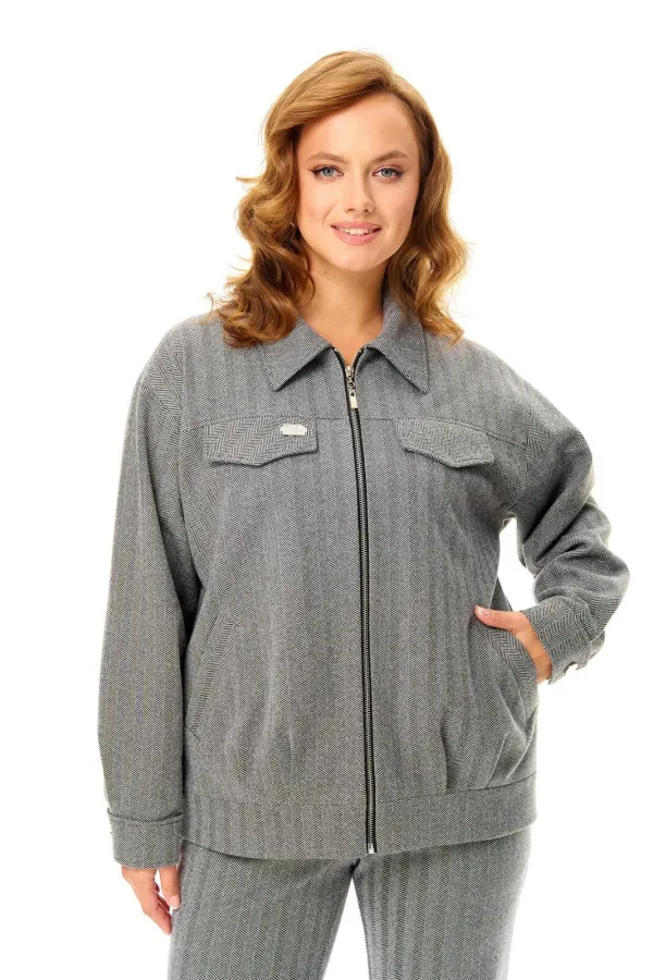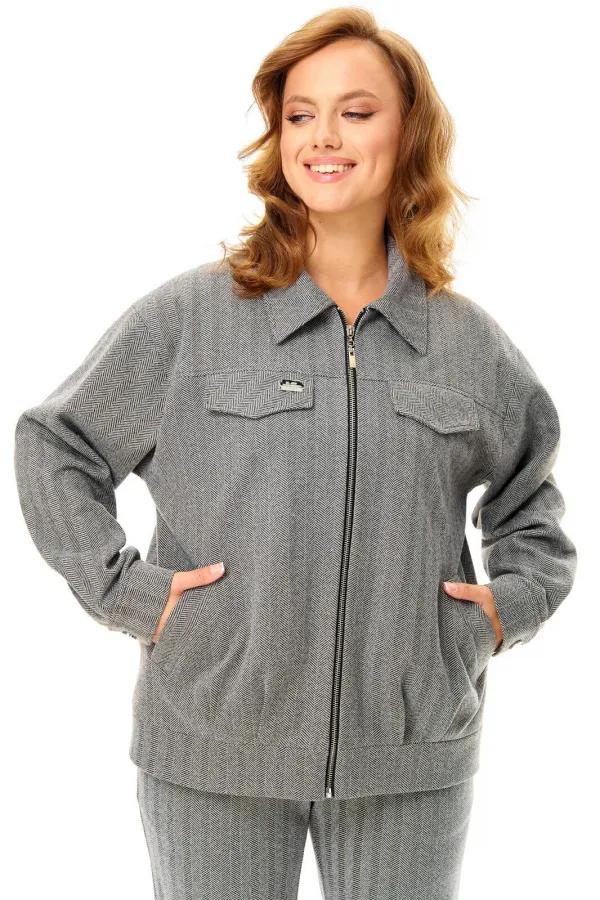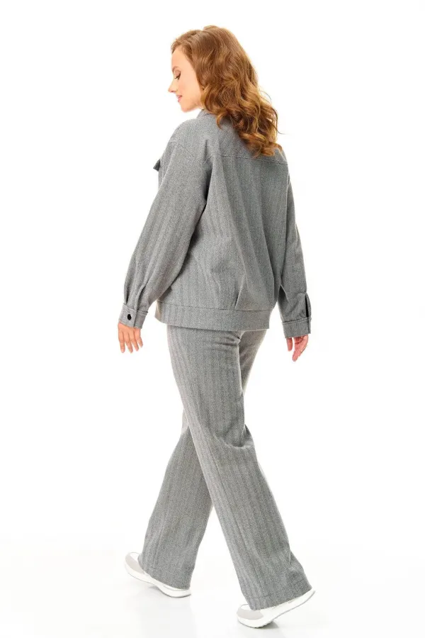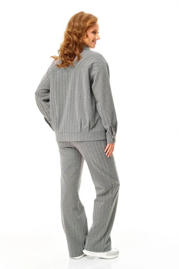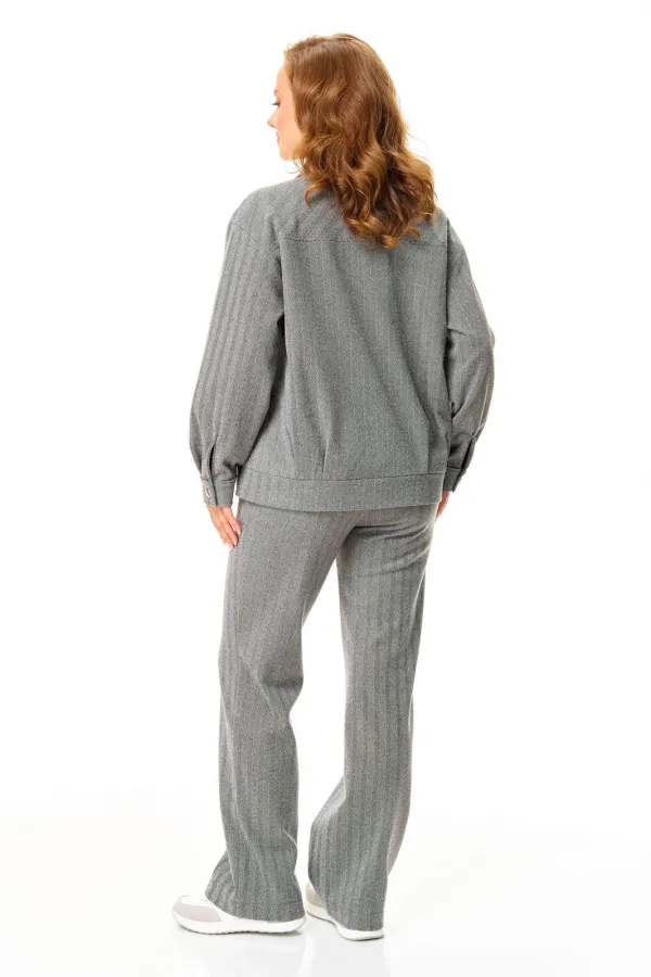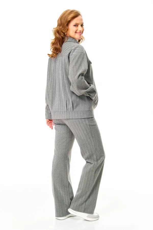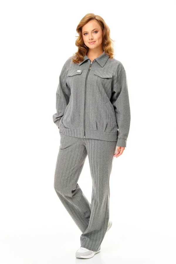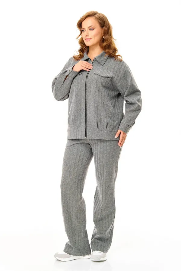 Комплект женский состоит из бомбера и брюк. Бомбер прямого свободного покроя со спущенной линией плеча на подкладке.По переду обработаны кокетки с клапанами и прорезные карманы с листочкой.Застежка центральная бортовая на металлическую тесьму молнию.На спинке обработана отрезная кокетка.По низу бомбера притачной пояс.На спинке и переде в шве притачивания пояса, заложены лёгкие односторонние складки.Воротник отложной.Рукав рубашечного покроя, полноценной длины.Низ рукава обработан притачной манжетой с застежкой на кнопку.На одном из клапанов имеется декоративная нашивка.Брюки свободные прямого силуэта.Пояс притачной на резинке.В боковых швах карманы.