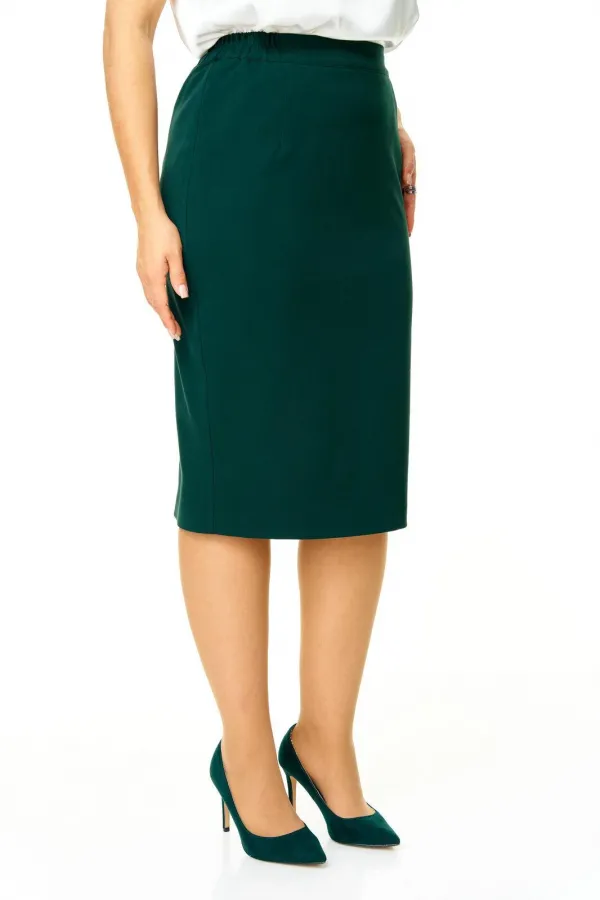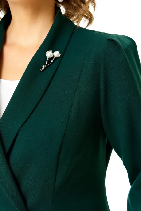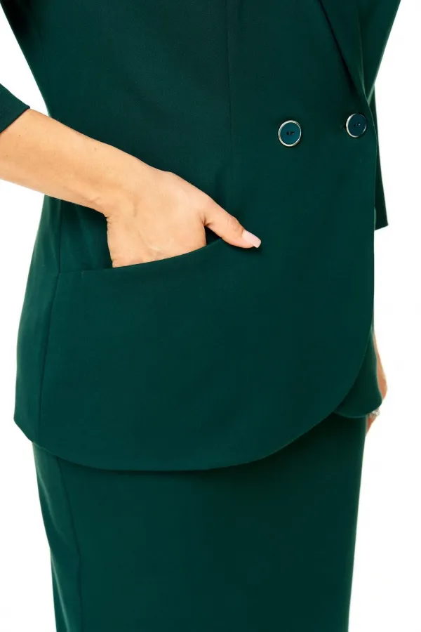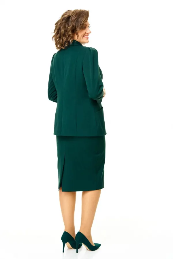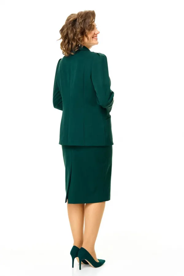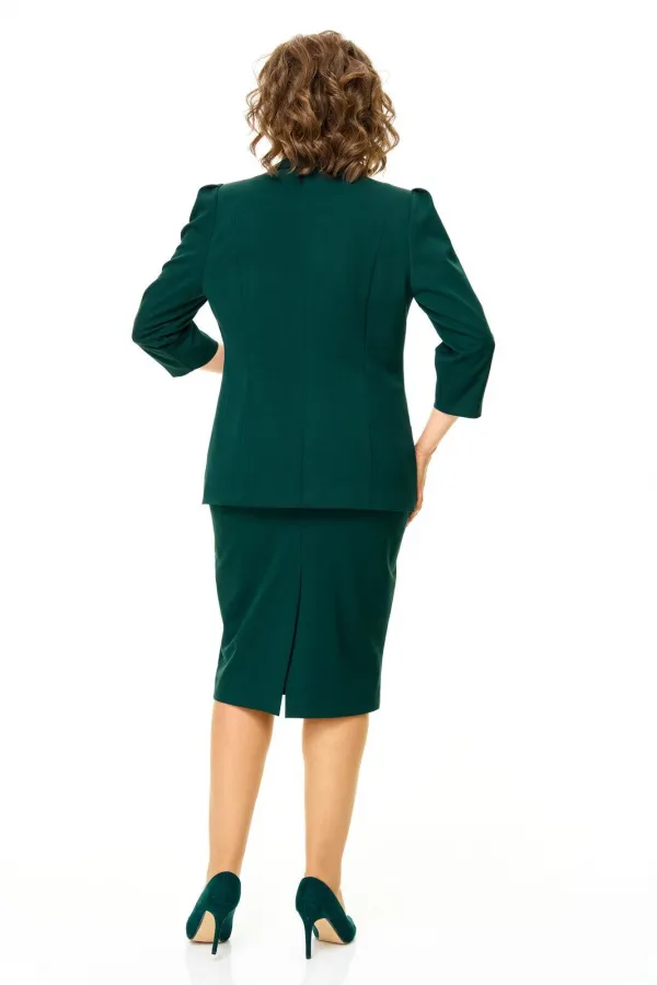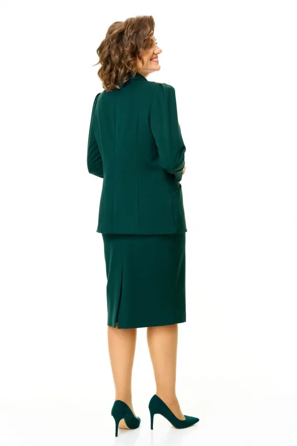 Костюм женский состоит из жакета и юбки.Жакет полуприлегающего покроя с зауженной линией плеча на подкладке.Застежка двубортная петли-пуговицы.По спинке и переду обработаны рельефы выходящие из плеча.Низ борта округлой формы.Воротник типа шаль.По переду обработаны карманы в подрезах.Рукав длиной 3/4 со складками по окату.Юбка на подкладке зауженного силуэта типа карандаш.В среднем шве заднего полотнища застежка на потайную тесьму-молнию и шлица.Пояс притачной с резинкой в боковых швах.В комплект входит съёмная металлическая брошь.
