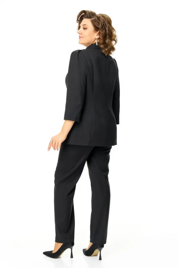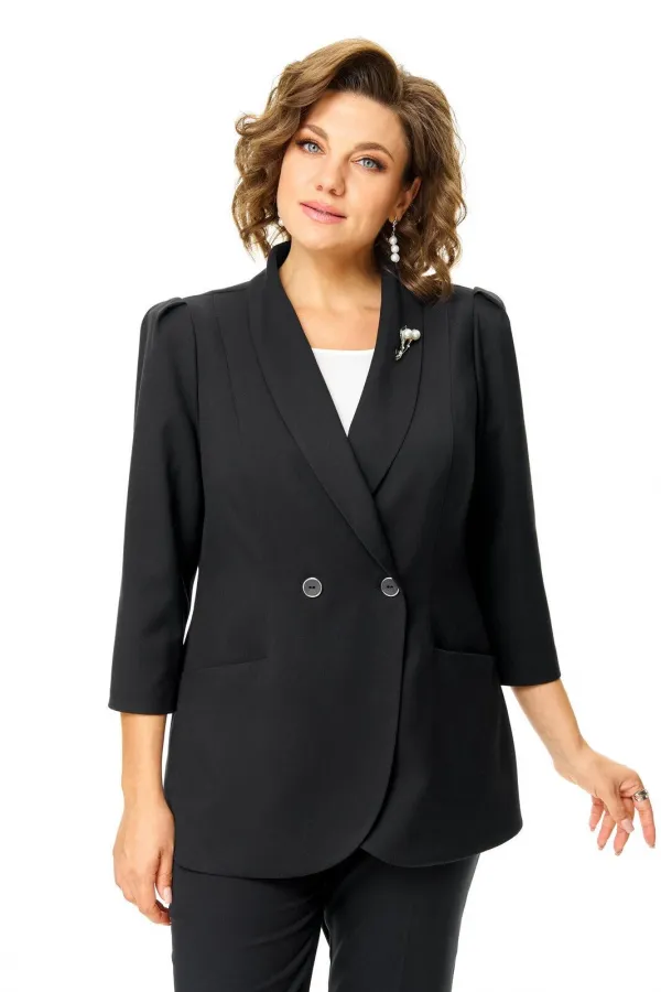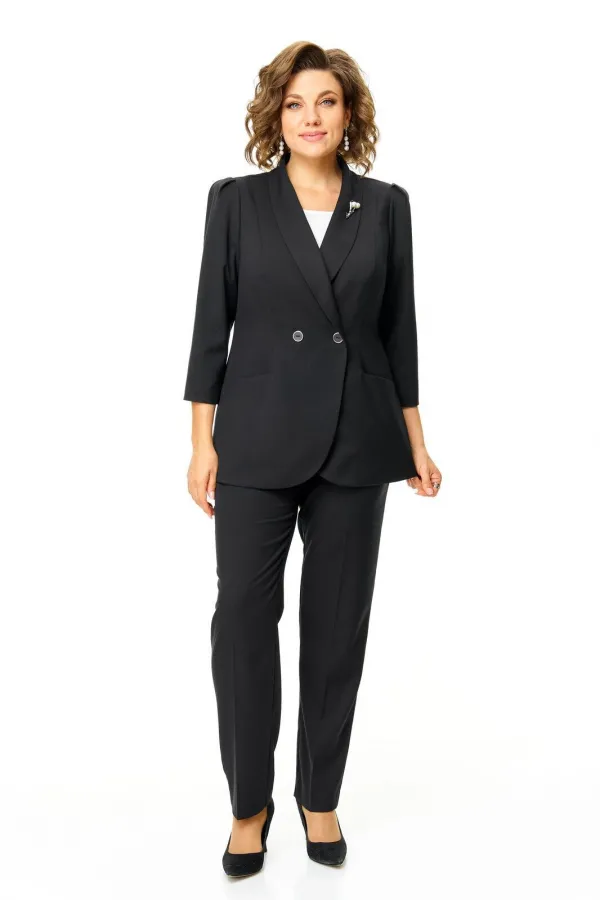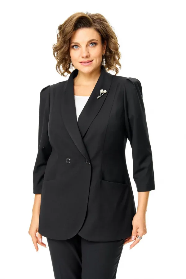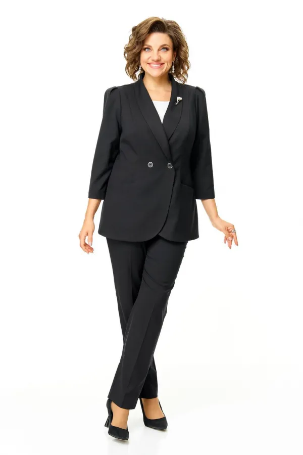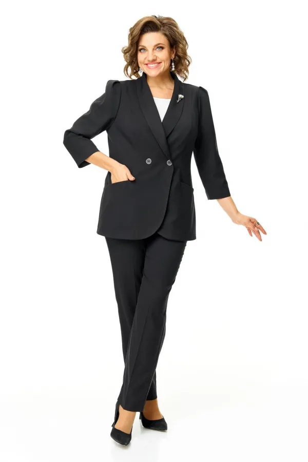 Костюм женский состоит из жакета и брюк.Жакет полуприлегающего покроя с зауженной линией плеча на подкладке.Застежка двубортная петли-пуговицы.По спинке и переду обработаны рельефы выходящие из плеча.Низ борта округлой формы.Воротник типа шаль.По переду обработаны карманы в подрезах.Рукав длиной 3/4 со складками по окату.Брюки зауженные к низу, с центральной застёжкой на молнию и петлю-пуговицу.В боковых швах карманы с отрезным бочком.Пояс притачной с резинкой по бокам.В комплект входит съёмная металлическая брошь.
