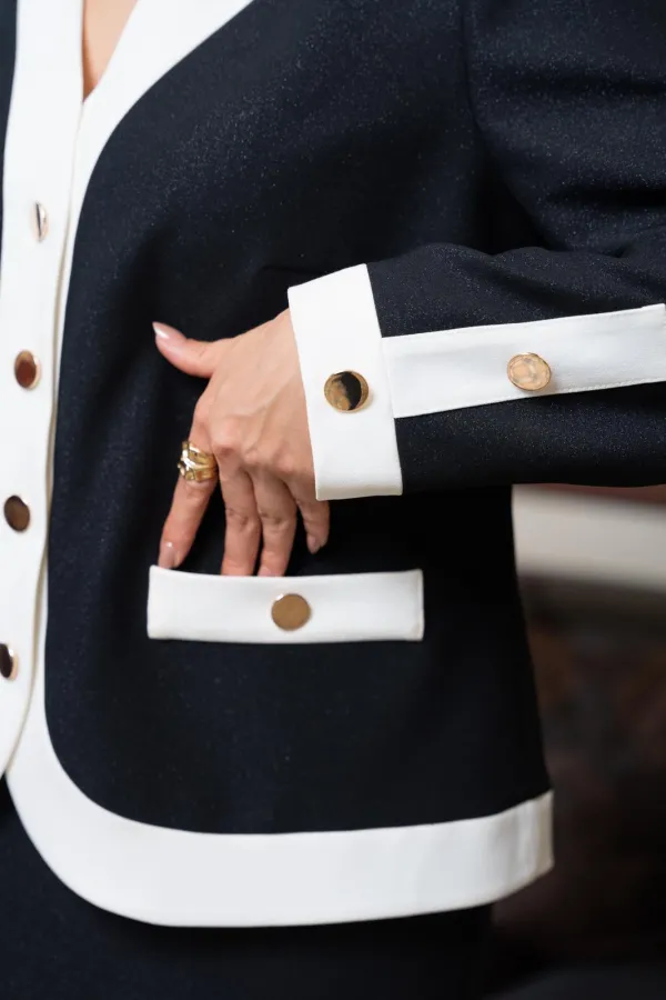 Костюм женский состоит из жакета и юбки. Жакет свободного покроя с естественной линией плеча на подкладке.Спинка со средним швом.Перед с нагрудными вытачками и настроченными листочками.По переду обработана отрезная планка плавно переходящая в борт и горловину.Вырез горловины V-образной формы.Борта жакета закруглённые.Застежка центрально-бортовая на петли-пуговицы.Рукав двухшовный длинный с отрезной манжетой и настроченной планкой.Юбка на подкладке зауженного силуэта типа карандаш. В среднем шве заднего полотнища застежка на потайную тесьму-молнию и шлица.Пояс притачной с резинкой в боковых швах.Вся фурнитура металлическая premium качества.