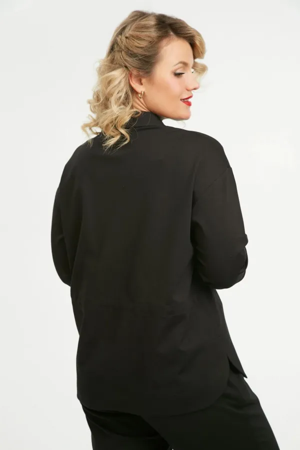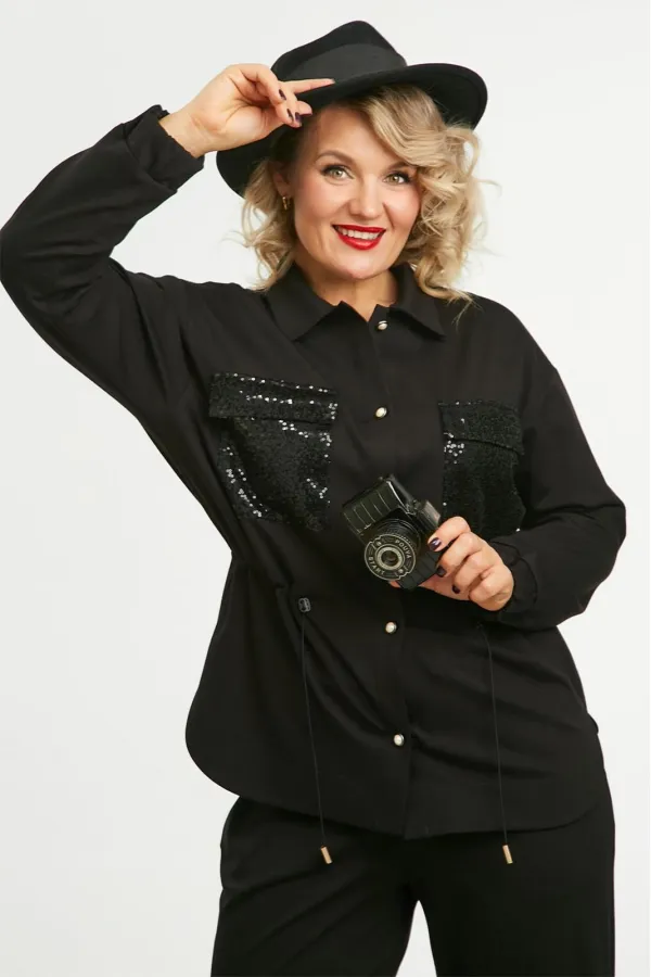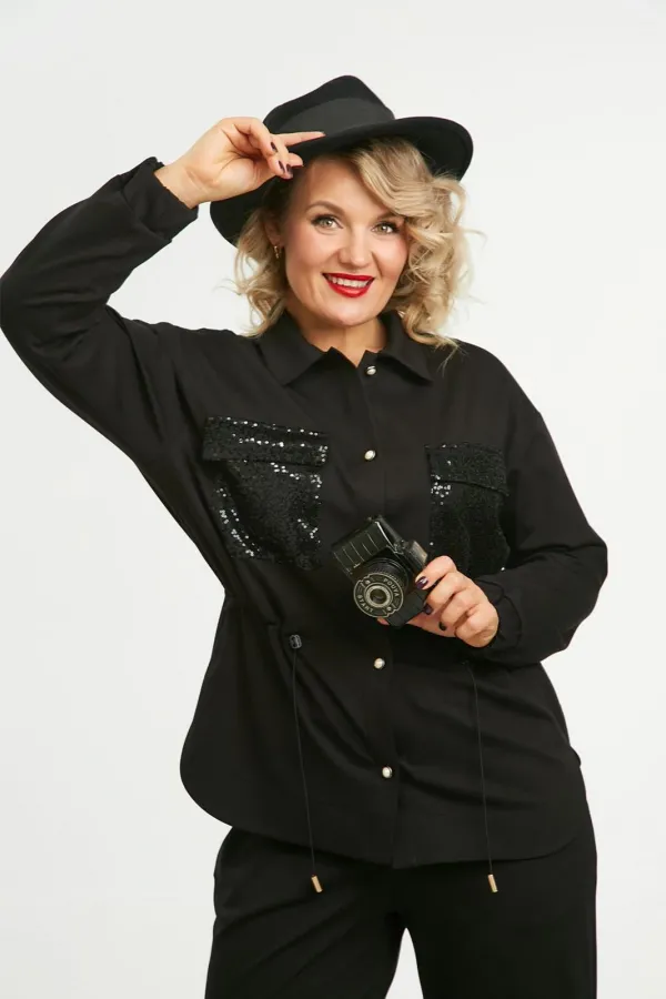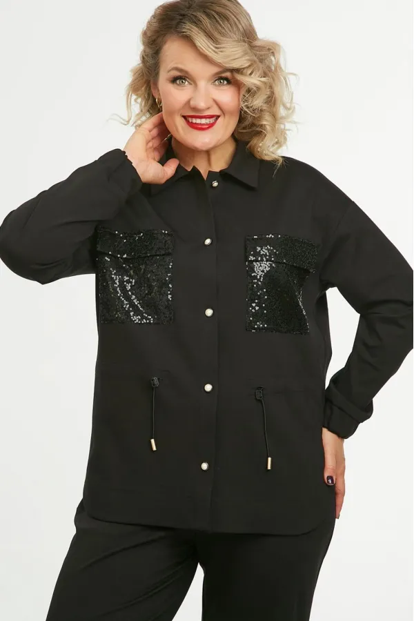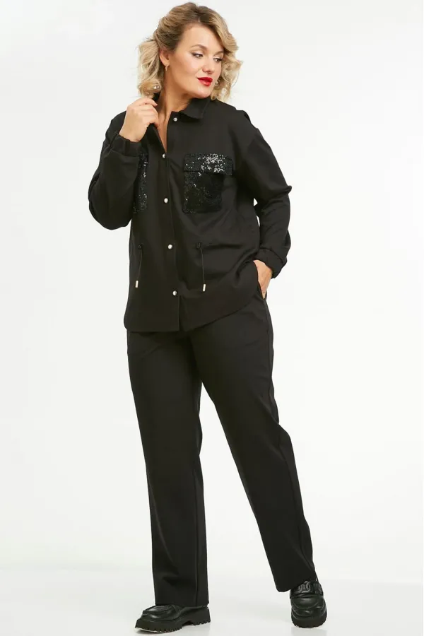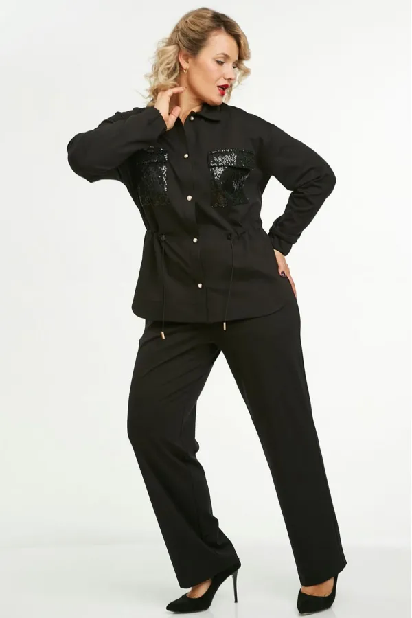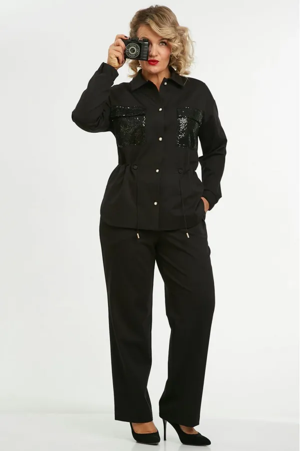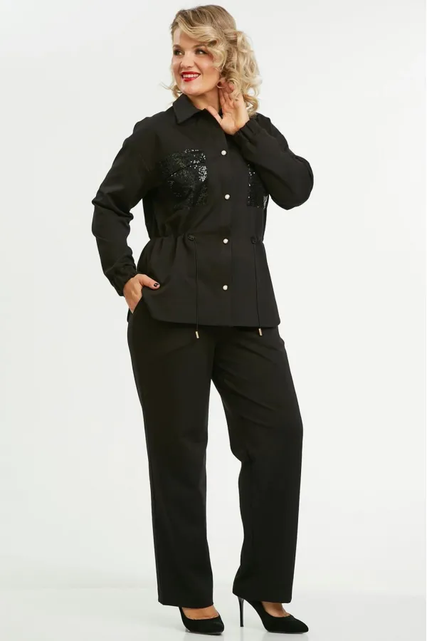 Элегантный женский костюм, созданный для современных и стильных образов. Костюм сочетает в себе классический крой и модные детали, обеспечивая комфорт и безупречный внешний вид. Изготовлен брючный костюм больших размеров из качественного трикотажа, который приятен к телу и не сковывает движений. Надежная застежка на пуговицы и петли. Воротник рубашечного типа добавляет костюму элегантности. На полочках настрочены стильные отделочные карманы с клапаном, декорированные мерцающими пайетками. Эта деталь становится ярким акцентом всего ансамбля. Кулиска: По талии пиджака удлиненного проходит кулиска, в которую вставлена резинка с фиксатором и металлическими наконечниками. Это позволяет регулировать степень прилегания, подчеркивая линию талии.