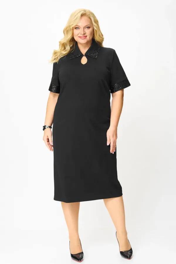 Платье выполнено из приятной эластичной ткани, мягко драпируется по фигуре и обеспечивает комфорт в течение всего дня. Платье трикотажное прямого силуэта визуально стройнит, подходит для любого типа фигуры. На груди платья миди изящный вырез-капелька, воротник и манжеты украшены пайетками, добавляя блеска и праздничного настроения.