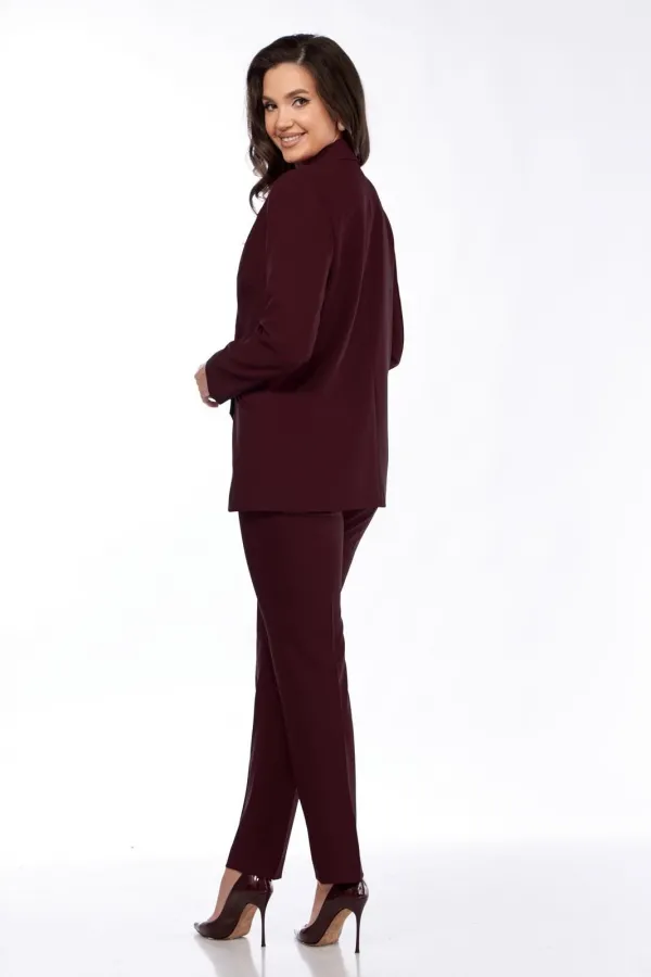 Костюм женский полуприлегающего силуэта, двухпредметтный, состоящий из жакета и брюк. Жакет на подкладке со смещённой бортовой застёжкой на 3 петли-пуговицы и 1 потайную петлю-пуговицу. Перед с отрезными бочками с талиевой вытачкой и карманами с листочкой. Правая часть переда имеет фигурный ассиметричный подрез. Спинка со средним швом. Рукава втачные двухшовные длинные. Воротник пиджачного типа. Брюки классического кроя, слегка зауженные к низу с притачным поясом на резинке по задним половинкам и с застёжкой на тесьму-молнию в средних срезах передних половинок и 1 петлю-пуговицу по поясу. На передних половинках брюк косые боковые карманы. На брюках заутюжены канты. Длина жакета по спинке - 68,5 см. Длина рукава - 61 см. Длина брюк по центру передней половинки - 99,5 см.
