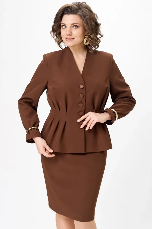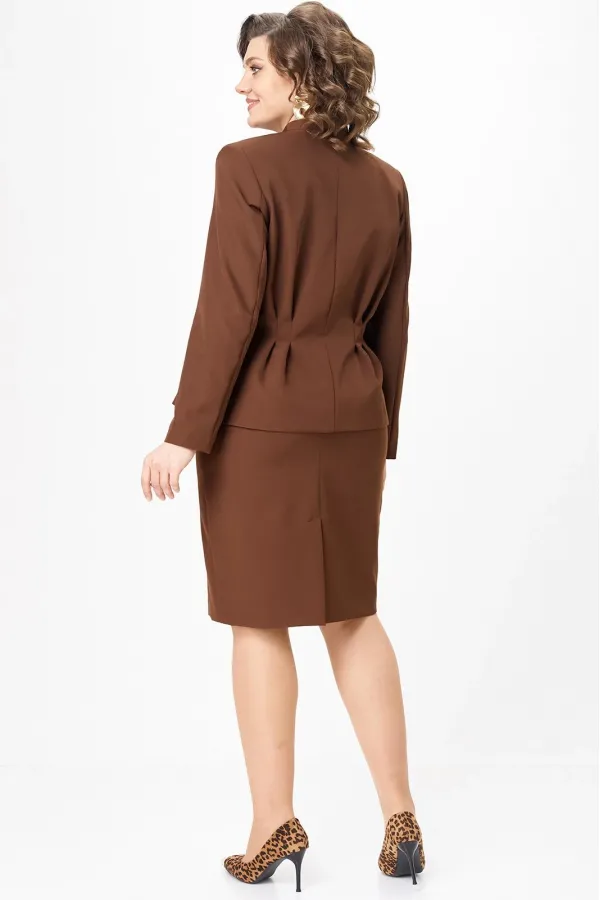 Костюм женский двухпредметный, состоящий из жакета и юбки. Жакет полуприлегающего силуэта с центральной бортовой застежкой на 5 петель-пуговиц. По переду обработаны нагрудные вытачки и по 3 защипа-складки по талии. Спинка со средним швом и двумя защипами-складками с двух сторон. Горловина V-образной формы, с цельнокроенной стойкой и с отрезным швом по спинке. Рукав втачной двухшовный длинный. Юбка заужена к низу, длиной за колено. Переднее полотнище с талиевыми вытачками. Заднее полотнище со средним швом, заканчивающимся шлицей, и с застежкой на потайную тесьму-молнию. Заднее полотнище также с талиевыми вытачками по 2 шт.