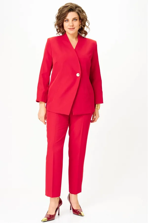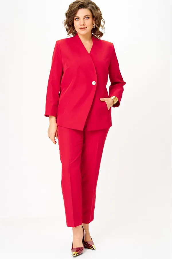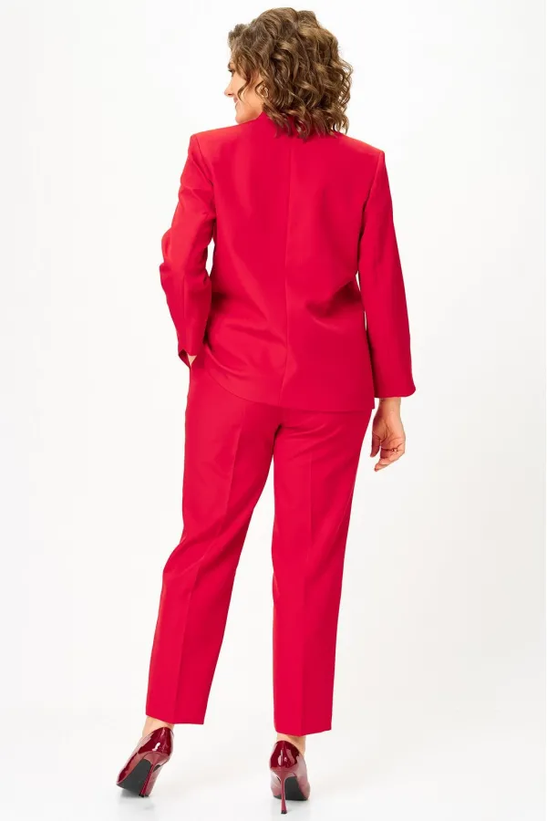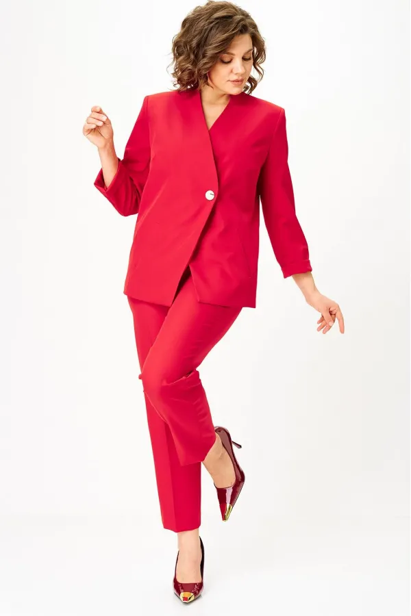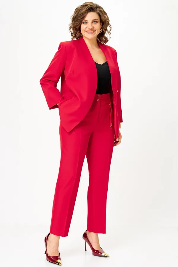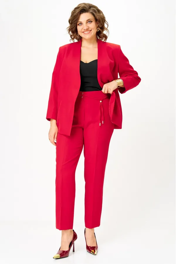 Костюм женский двухпредметный, состоящий из жакета и брюк. Жакет полуприлегающего силуэта со спущенной застежкой на одну декоративную петлю-пуговицу и одну потайную. Перед с отрезным бочком, в котором обработана вытачка, и с карманами с листочкой. Спинка со средним швом. Борт имеет фигурную форму. Горловина - по переду цельнокроенная стойка, а по спинке - отрезная со средним швом. Рукава втачные длинные двухшовные. Брюки классического кроя, зауженные к низу, с притачным поясом, от входа в карман вкруговую с широкой резинкой. Застежка на тесьму-молнию в средних срезах передних половинок и на 2 петли-пуговицы по поясу. Также по поясу вставлен шнурок с фиксатором и наконечниками. Карманы наклонные к боковому шву. На брюках заутюжены канты.