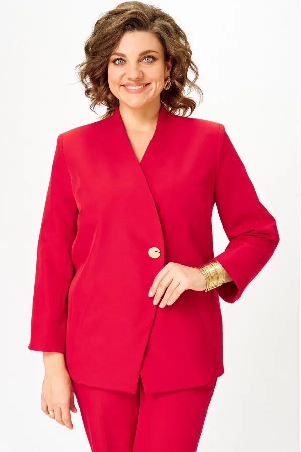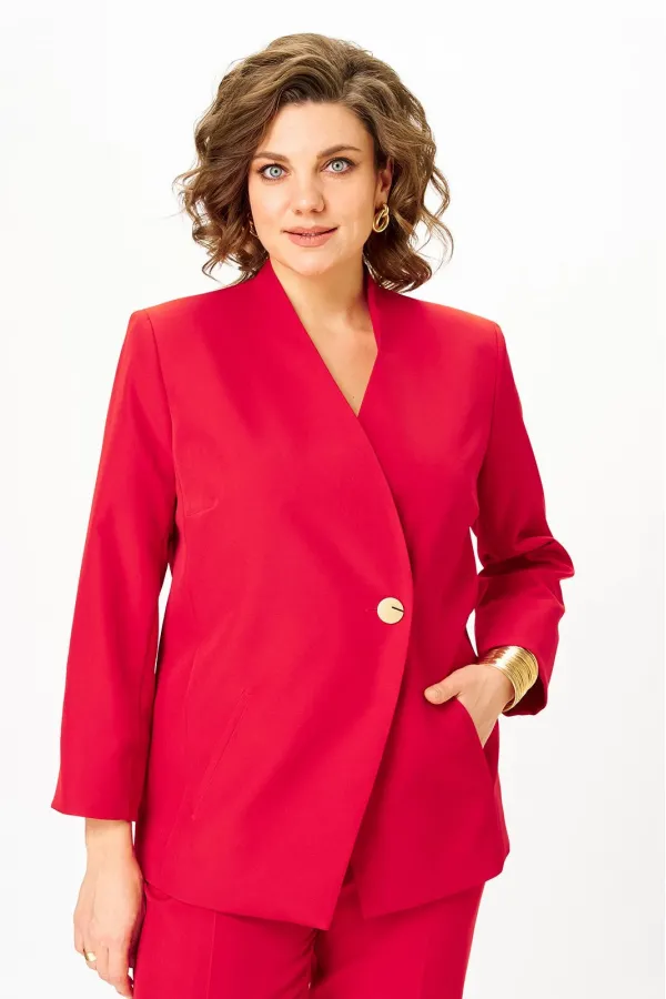 Костюм женский двухпредметный, состоящий из жакета и брюк. Жакет полуприлегающего силуэта со спущенной застежкой на одну декоративную петлю-пуговицу и одну потайную. Перед с отрезным бочком, в котором обработана вытачка,... Читать далее...