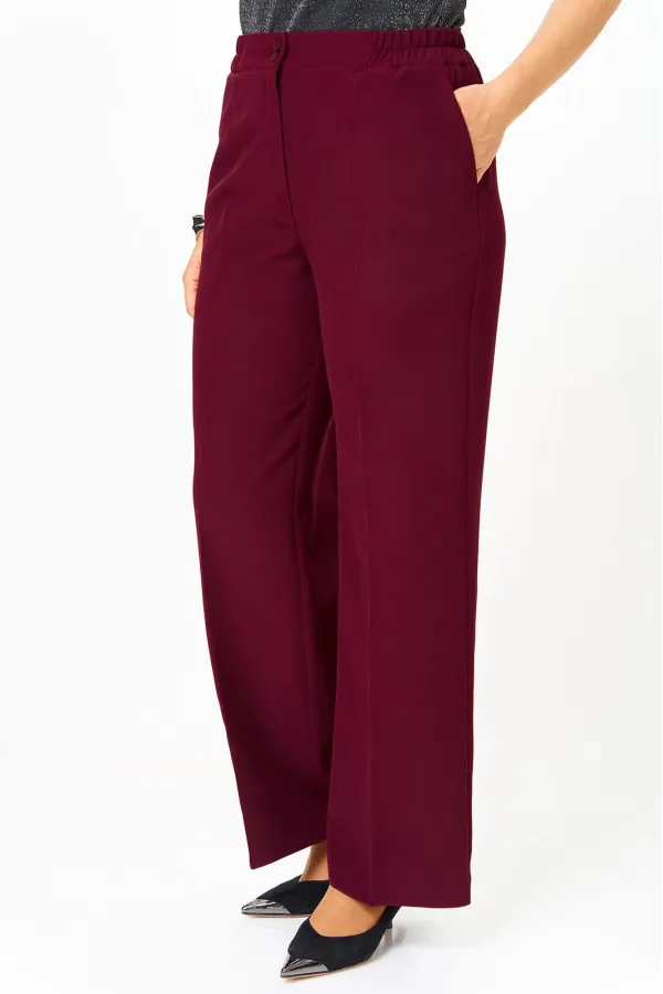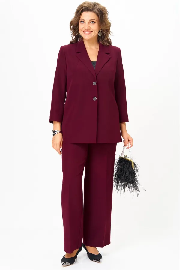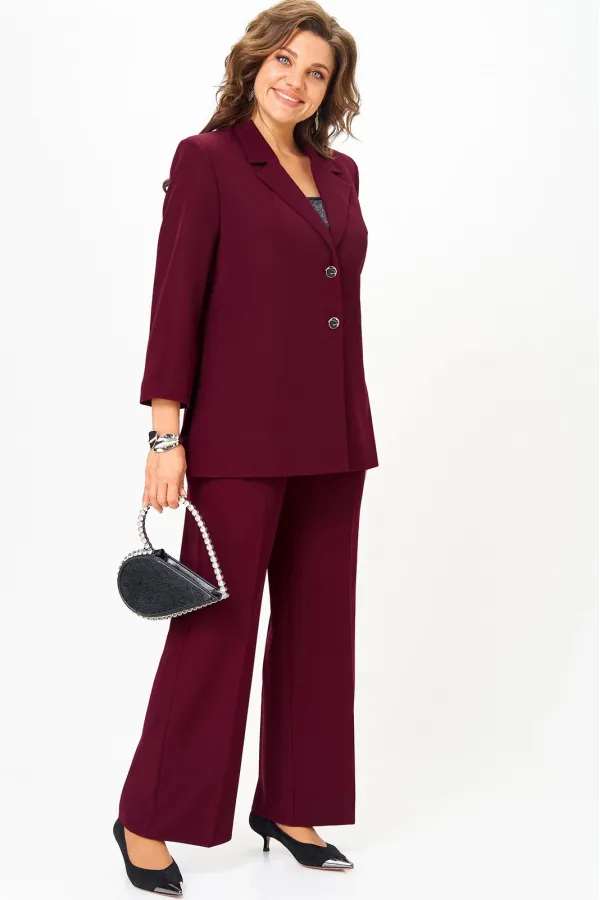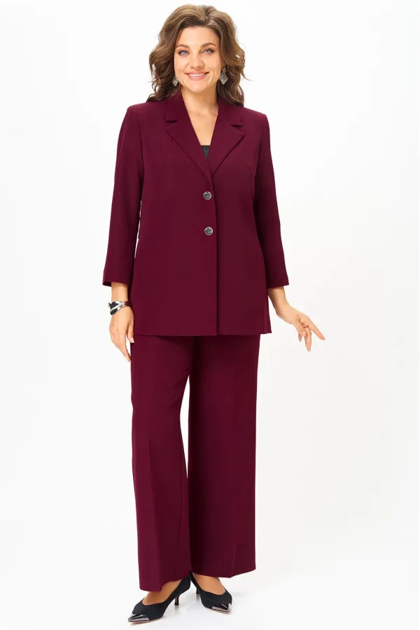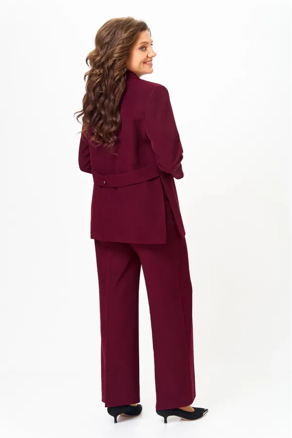 Костюм женский двухпредметный, состоящий из жакета и брюк. Жакет полуприлегающего силуэта, удлиненный, с центральной бортовой застежкой на 2 петли-пуговицы до линии перегиба лацкана. Перед с нагрудными вытачками, выходящими из горловины. Боковые швы с разрезами, между которыми по спинке вставлен пояс фигурной формы с декоратичной нашивкой. Спинка со средним швом. Воротник пиджачного типа. Рукава втачные двухшовные длиной 3/4. Брюки палаццо с притачным широким поясом на резинке от заутюженных стрелок по передней половинке вкруговую. Застежка на тесьму-молнию в средних срезах передних половинок брюк и 2 петли-пуговицы по поясу.