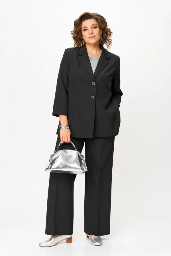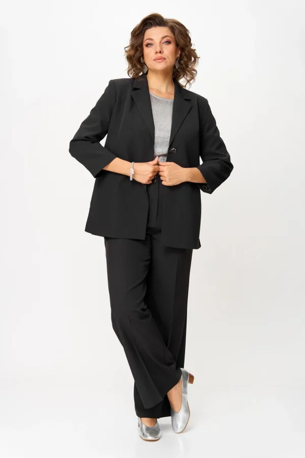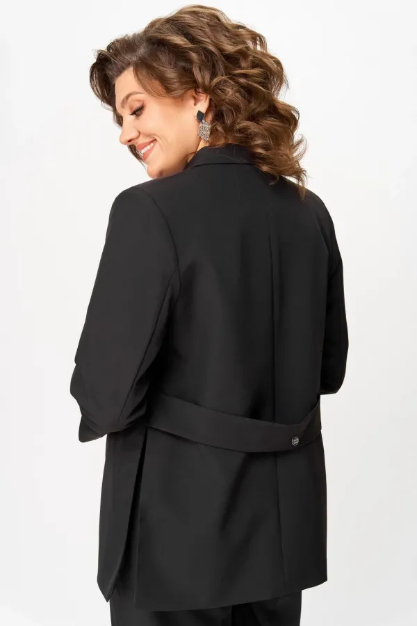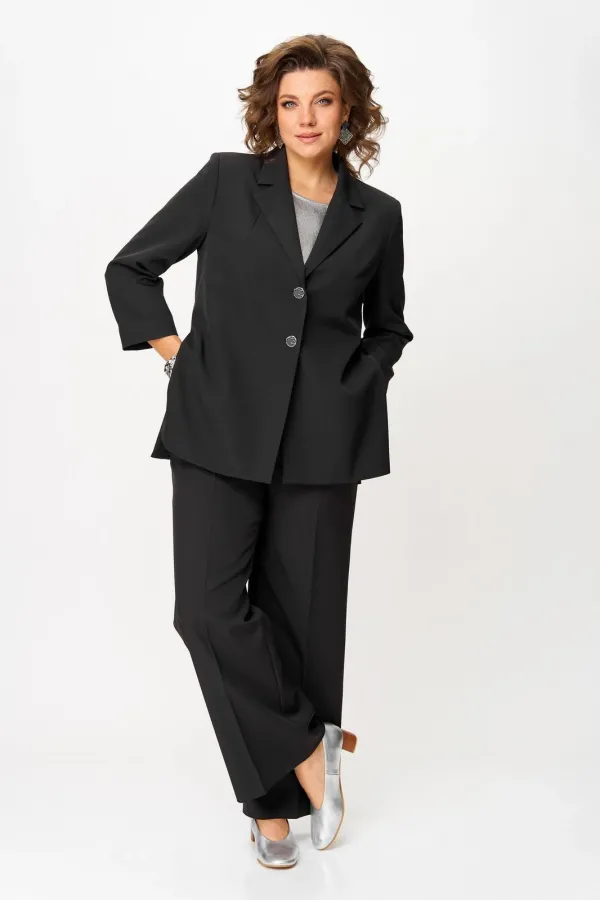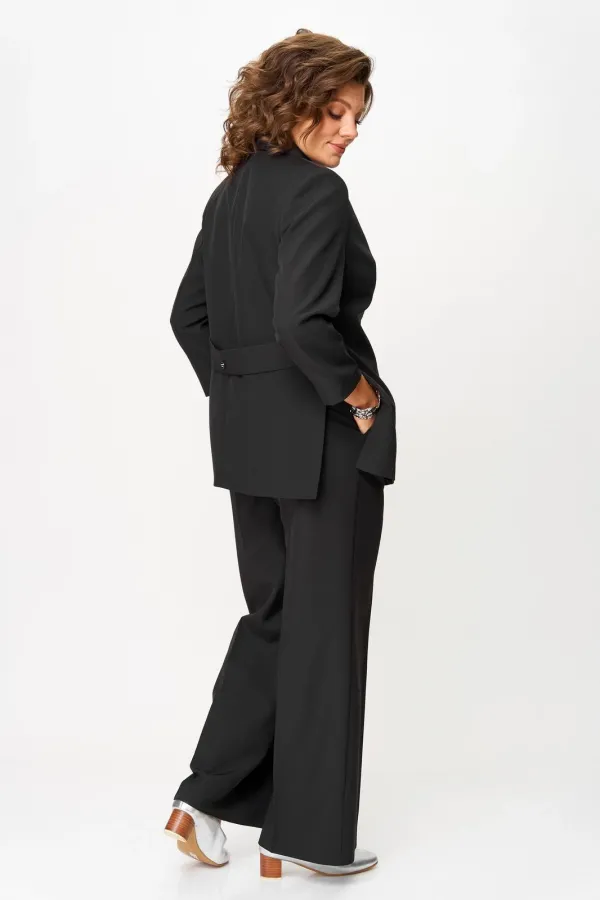Костюм женский двухпредметный, состоящий из жакета и брюк. Жакет полуприлегающего силуэта, удлиненный, с центральной бортовой застежкой на 2 петли-пуговицы до линии перегиба лацкана. Перед с нагрудными вытачками, выходящими из горловины. Боковые швы с разрезами, между которыми по спинке вставлен пояс фигурной формы с декоратичной нашивкой. Спинка со средним швом. Воротник пиджачного типа. Рукава втачные двухшовные длиной 3/4. Брюки палаццо с притачным широким поясом на резинке от заутюженных стрелок по передней половинке вкруговую. Застежка на тесьму-молнию в средних срезах передних половинок брюк и 2 петли-пуговицы по поясу.