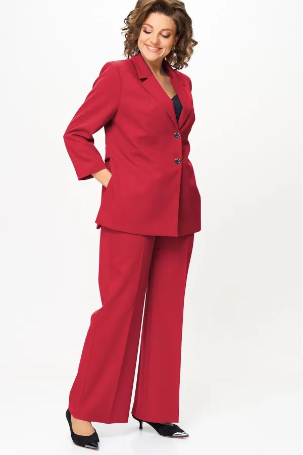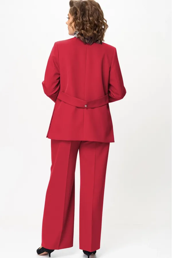 Костюм женский двухпредметный, состоящий из жакета и брюк. Жакет полуприлегающего силуэта, удлиненный, с центральной бортовой застежкой на 2 петли-пуговицы до линии перегиба лацкана. Перед с нагрудными вытачками, выходящими из горловины. Боковые швы с разрезами, между которыми по спинке вставлен пояс фигурной формы с декоратичной нашивкой. Спинка со средним швом. Воротник пиджачного типа. Рукава втачные двухшовные длиной 3/4. Брюки палаццо с притачным широким поясом на резинке от заутюженных стрелок по передней половинке вкруговую. Застежка на тесьму-молнию в средних срезах передних половинок брюк и 2 петли-пуговицы по поясу.