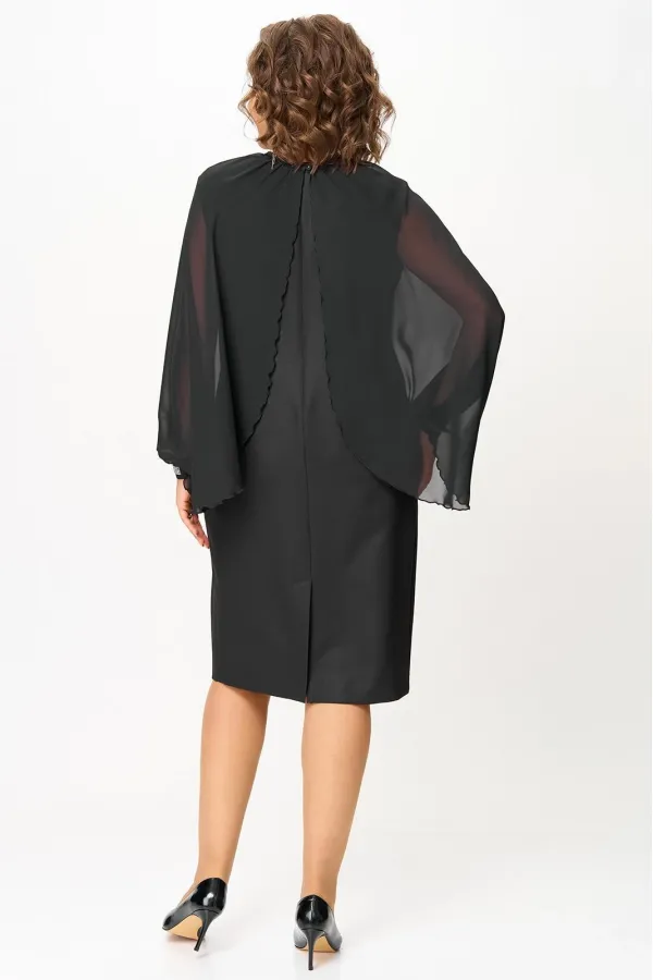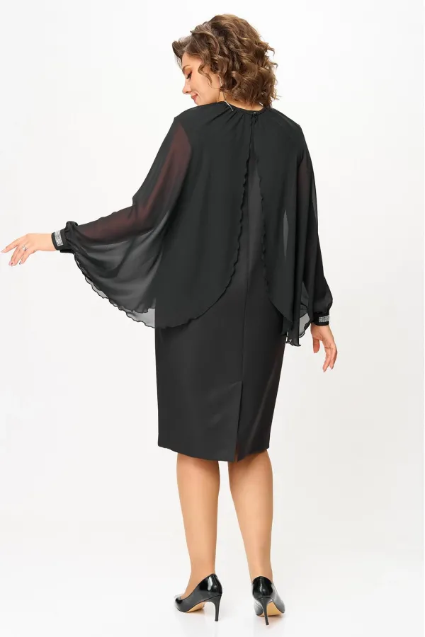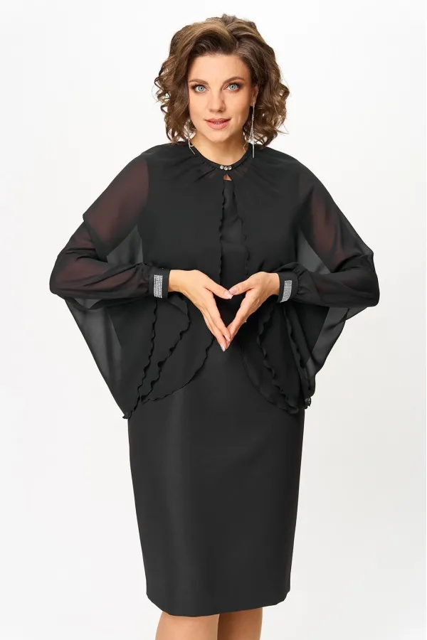 Комплект женский двухпредметный, состоящий из платья и болеро. Платье полуприлегающего силуэта, зауженное к низу. С кокетками и нагрудными вытачками, выходящими из пройм. Спинка со средним швом, в котором обработана шлица и застежка на потайную тесьму-молнию. Болеро из шифона с овальной присборенной горловиной, обработанной бейкой, украшенной по переду пришивными камнями, а сзади застегивающейся навесной петлей и пуговицей. В болеро цельнокроенные со спинкой и передом длинные рукава, заканчивающиеся манжетой с петлей и пуговицей и стыкующиеся по центру переда и спинки. Фигурные края изделия обработаны на флеш.
