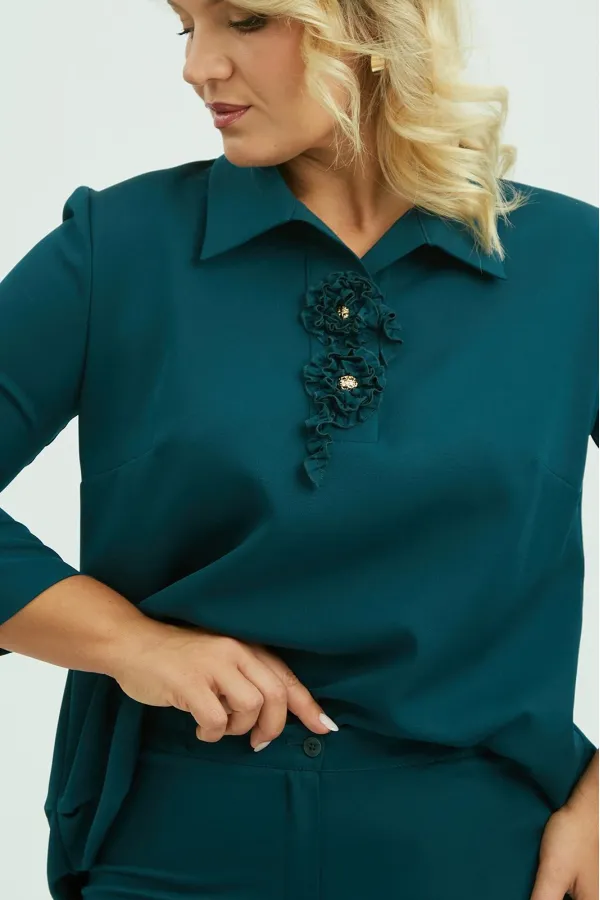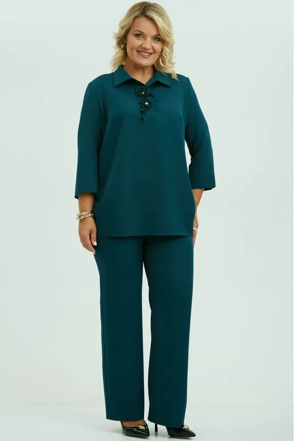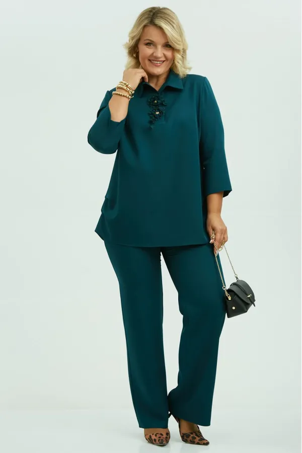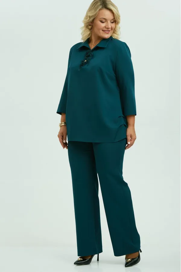 Костюм женский двухпредметный, состоящий из туники и брюк. Туника прямого силуэта со складками в боковых швах, нагрудными вытачками, выходящими из боковых швов, и застежкой на планке на 2 петли-пуговицы, деворированной двумя рюшами-розами. Воротник отложной. Спинка с горизонтальной кокеткой, нижние отлетные детали спинки фигурной формы на запах, декорированные пуговицами с цепочкой. Рукав втачной прямой одношовный длиной 3/4. Брюки прямого кроя с заутюженными стрелками и с притачным поясом от середины передних половинок с резинкой вкруговую. Застежка на тесьму-молнию и 1 петлю-пуговицу по поясу.