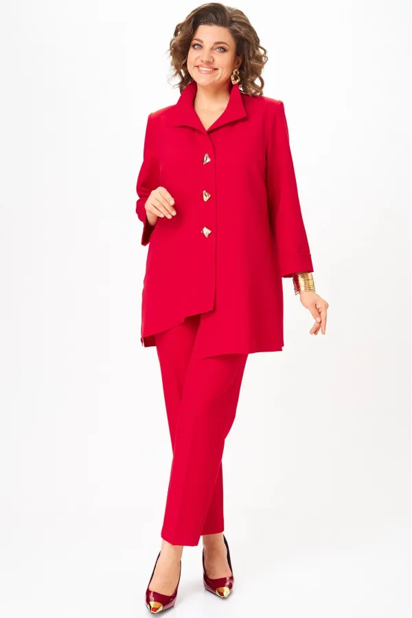 Комплект женский, состоящий из туники и брюк. Туника А-образного силуэта с центральной застежкой на планку до подреза на 3 декоративные петли-пуговицы. Перед с нагрудной вытачкой и фигурными подрезами. Спинка с горизонтальной кокеткой и двумя складками. В боковых швах обработаны разрезы. Низ переда ассиметричен и слегка разведен. Рукава втачные одношовные длиной 3/4 с защипом, имитирующим манжет. Воротник-стойка. Брюки классического кроя, зауженные к низу с притачным поясом сзади на резинке. Застежка на тесьму-молнию в среднем шве передних половинок и 1 петлю-пуговицу по поясу. На брюках заутюжены канты.