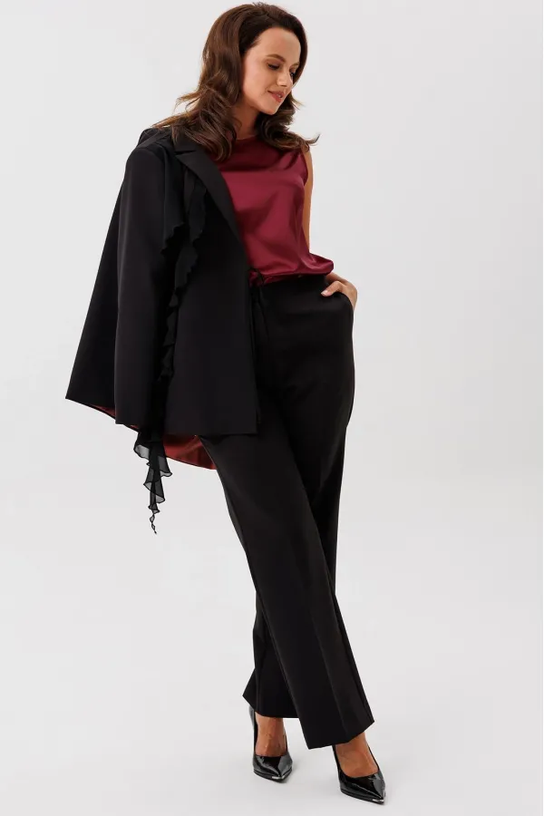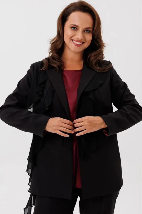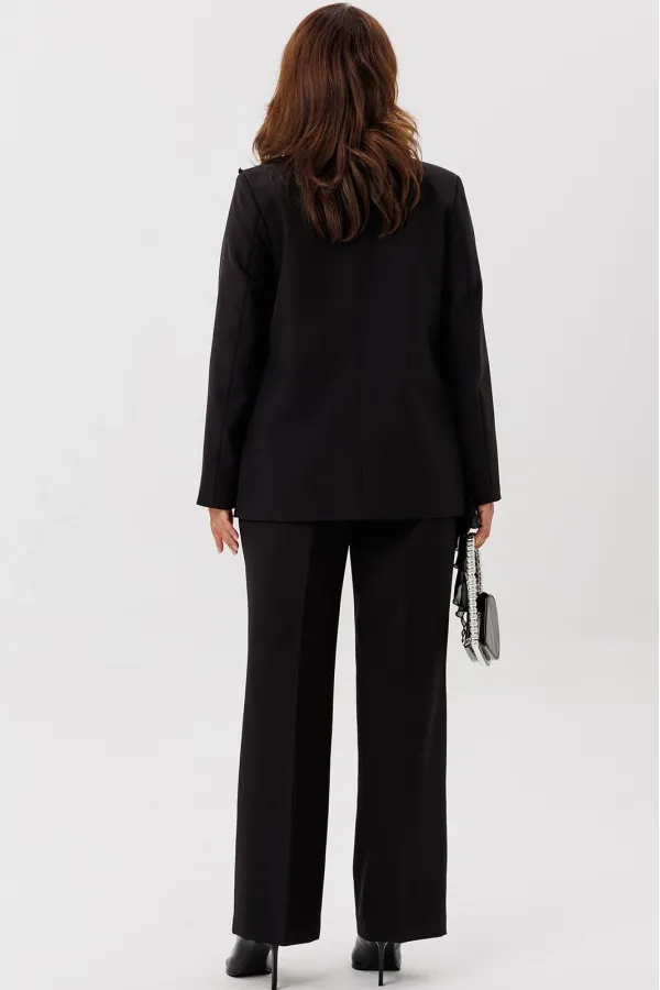 Костюм женский трехпредметный, состоящий из жакета, блузки и брюк. Жакет полуприлегающего силуэта, скомбинированный из двух видов ткани с центральной бортовой застежкой встык на завязки с фигурным подрезом из горловины и до бокового шва. Жакет с ассиметричными вставками из шифона в виде воланов. По правой части переда шифон с 3 складками вставлен по плечевому шву, частично по горловине и ниспадает из пройм. Второй волан вставлен в рельефный подрез, имеет разную ширину и не доходя до бокового шва ниспадает сходя на нет шлейфом. По левой части переда шифоновый волан фигурной формы вставлен в плечевой шов, горловину, и ниспадает на нет. Спинка со средним швом. Рукав втачной длинный двухшовный. Брюки классического кроя, прямые, с заутюженными кантами, с притачным поясом сзади на резинке и боковыми карманами с отрезным бочком. Застежка на тесьму-молнию в средних срезах передних половинок брюк.